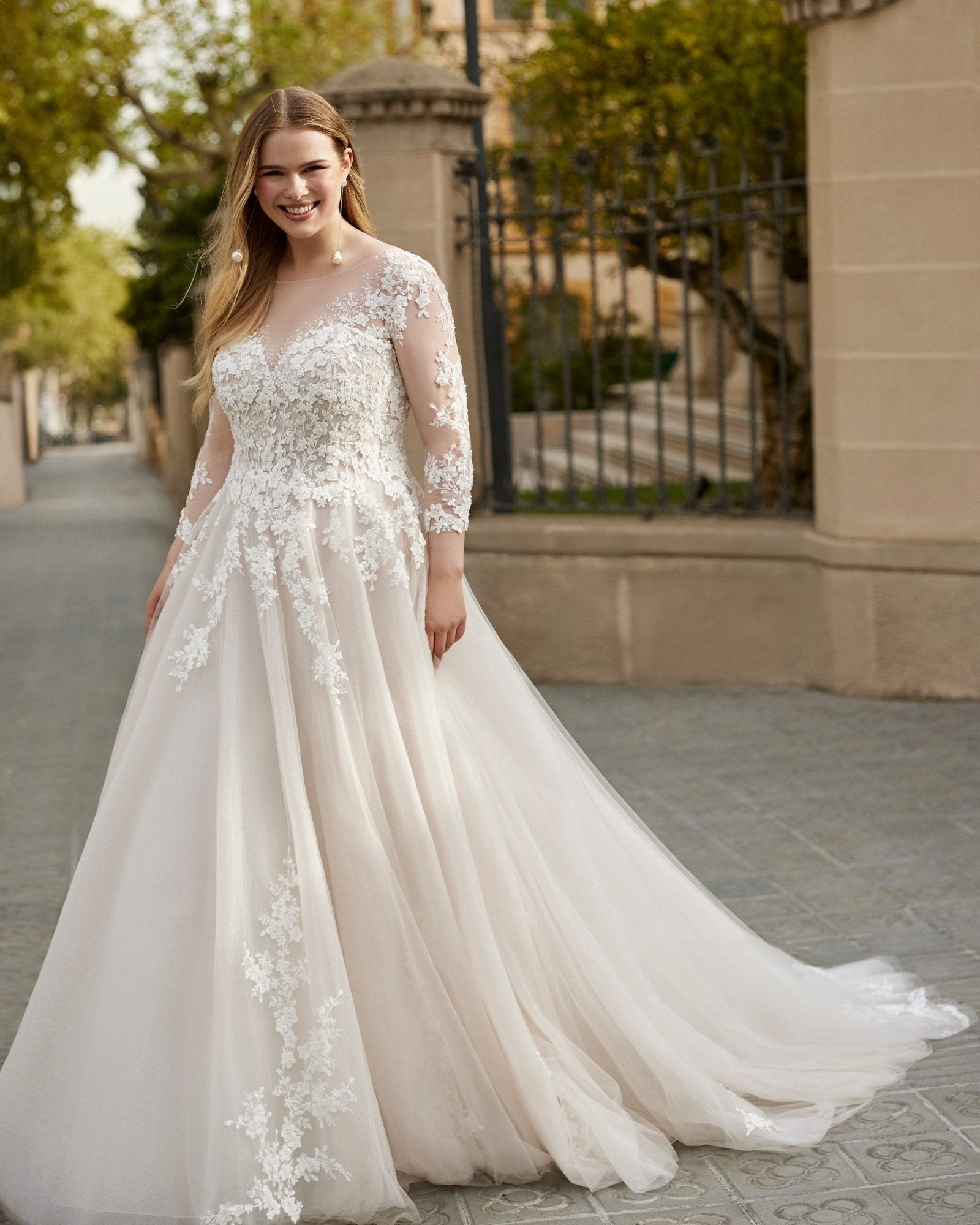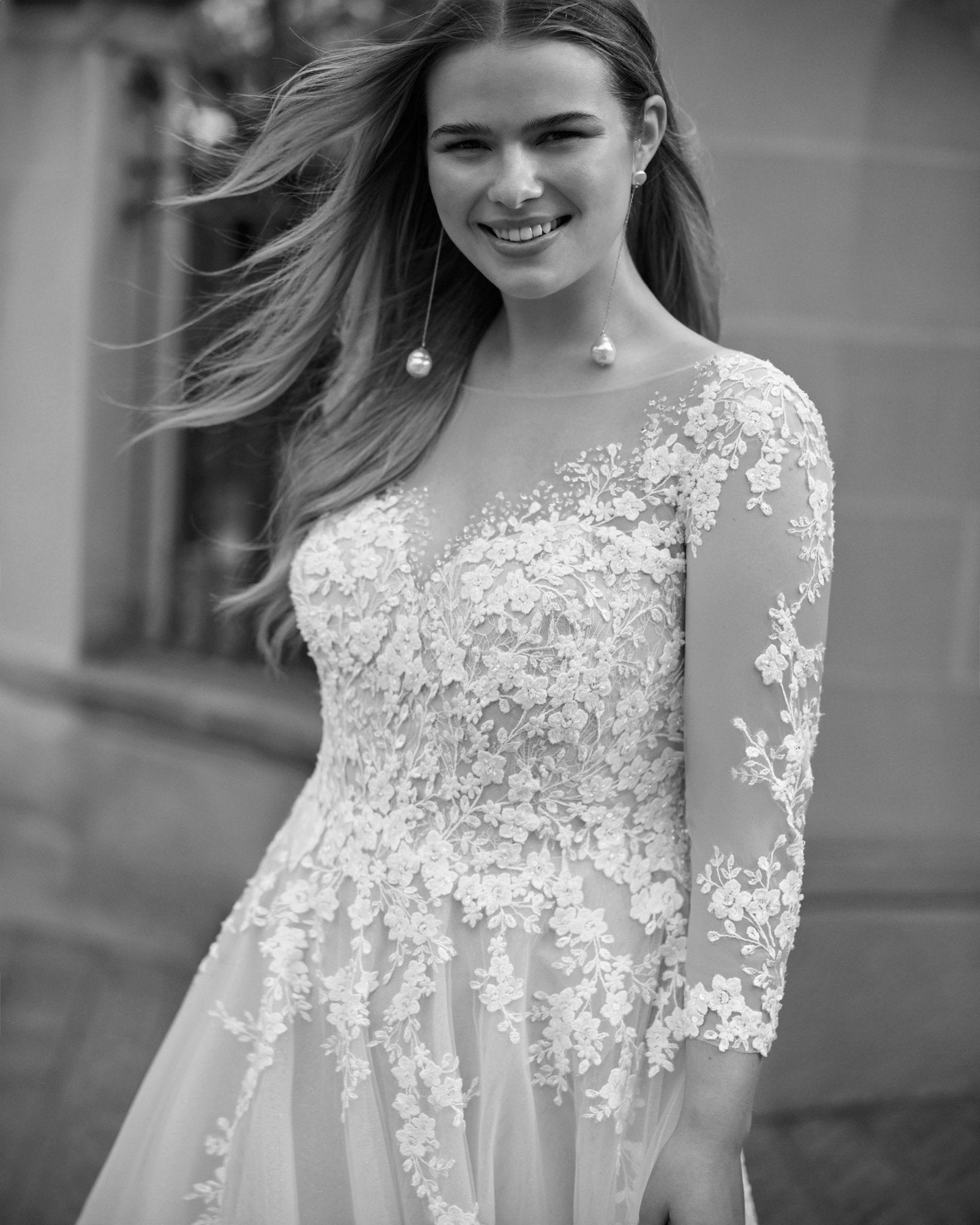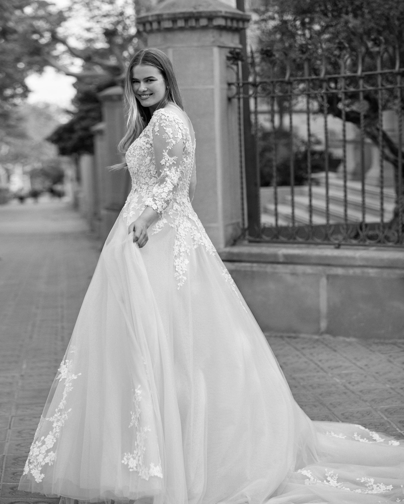 Abito da sposa realizzato in tulle e pizzo, presenta un taglio dritto che slancia la figura e un corpetto con scollo profondo sia sul davanti che sulla schiena, per un effetto elegante e sensuale. Le maniche lunghe ricamate aggiungono un tocco di delicatezza, mentre la mantella liscia completa il look con charme e regalità. Un modello pensato per far risplendere ogni sposa nel giorno del sì.