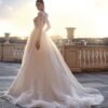 Lo scollo scollato è sostenuto da un inserto in tulle color carne e da coppe interne, mentre le spalle arricciate e le maniche lunghe aderenti creano un moderno look da sposa rinascimentale.