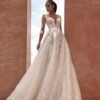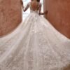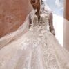Abito da sposa lungo in stile A-line, confezionato in tulle glitter luminoso e ricami floreali. Il corpetto effetto tattoo con scollo profondo a V e schiena aperta regala sensualità e leggerezza, mentre le applicazioni floreali che si diramano sulla gonna donano un tocco romantico e fiabesco.