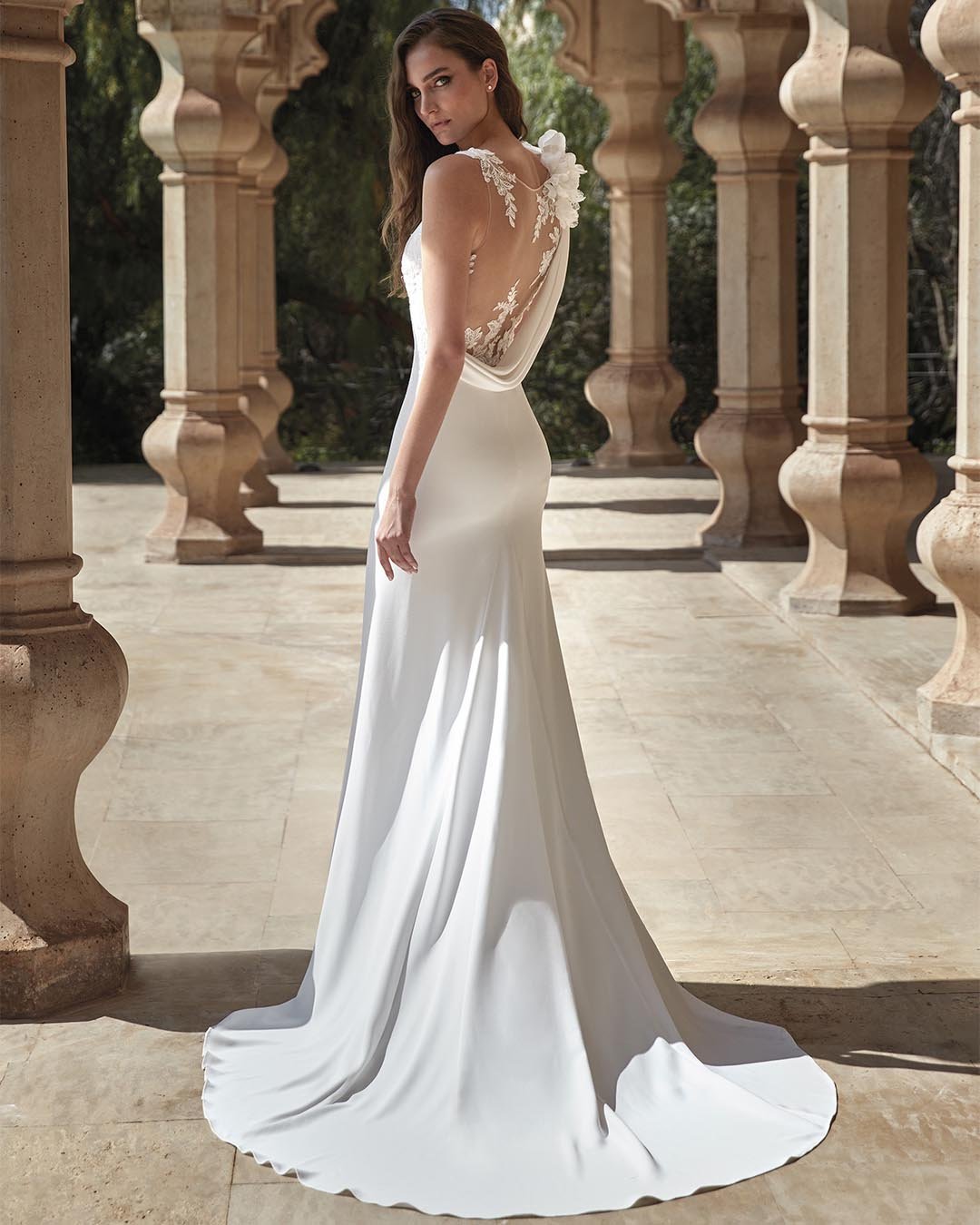 Abito da sposa sirena in crêpe e pizzo, di grande effetto e dal design moderno. Il profondo scollo a V geometrico dona carattere al corpetto, mentre la raffinata coda aggiunge maestosità. La schiena trasparente, arricchita da dettagli botanici e da applicazioni floreali tridimensionali sulle spalle, completa l’abito con un tocco unico e scenografico.