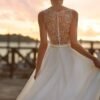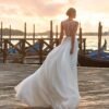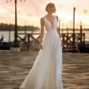 Leggerissimo abito da sposa in organza e dettagli di pizzo chantilly che incorniciano la scollatura profonda a V e la schiena con un effetto wow.
