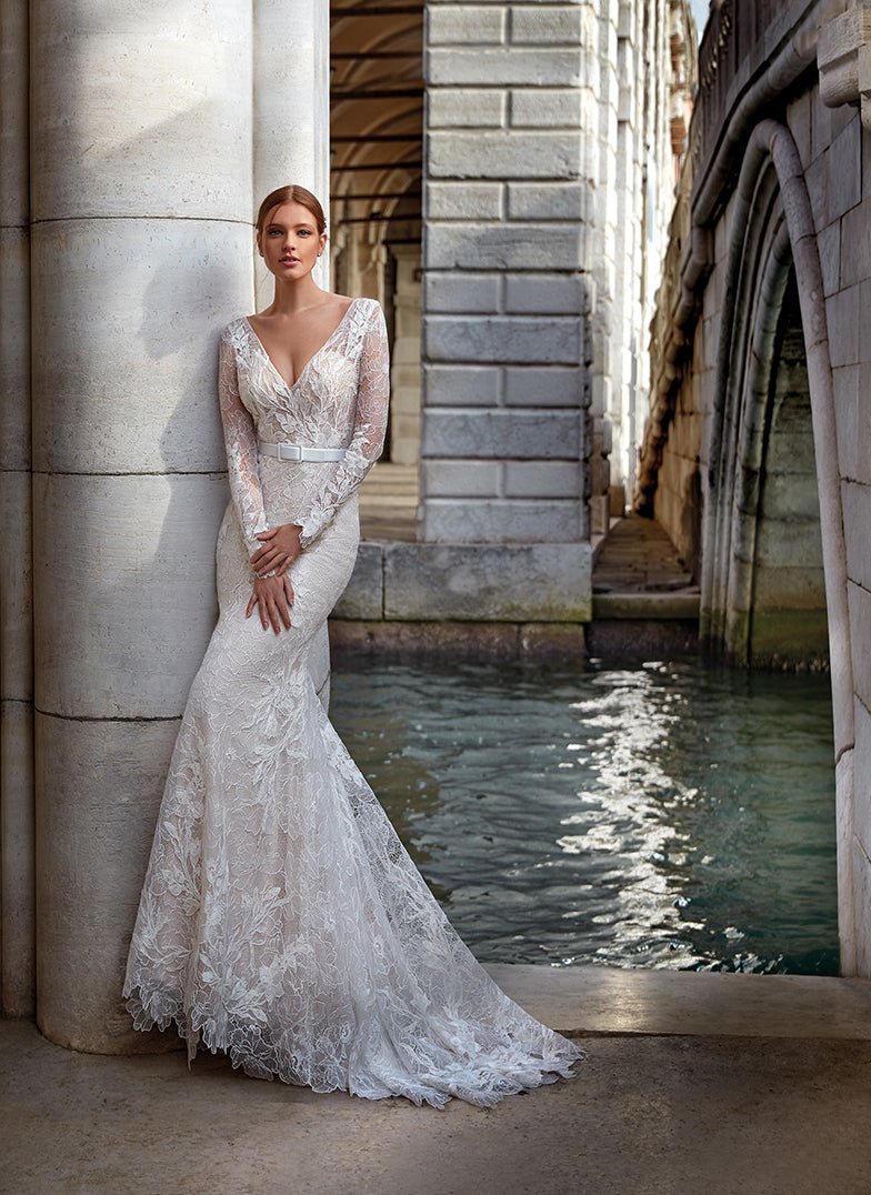 Favoloso abito da sposa a sirena in pizzo con strascico e maniche lunghe. Una cintura off white in vita e la scollatura a V completano un look indimenticabile ed elegante.