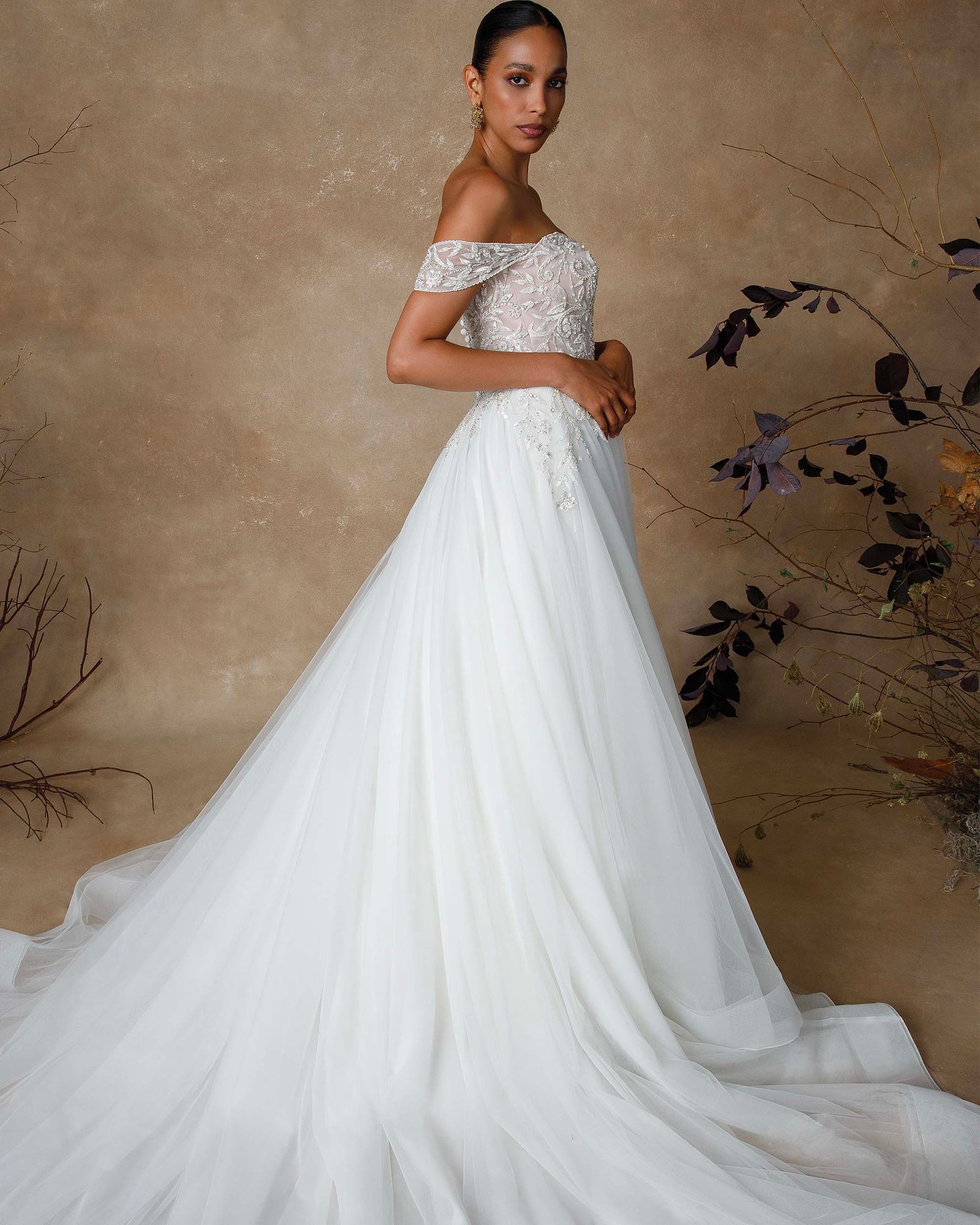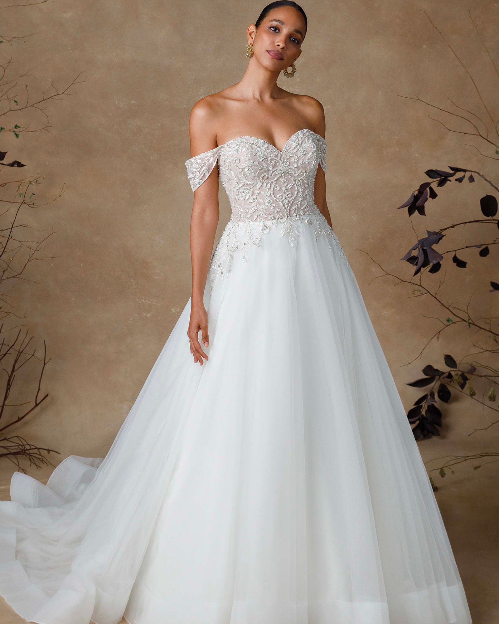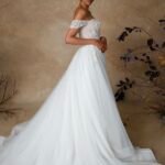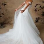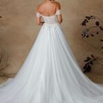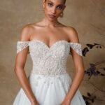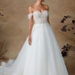 Abito da sposa in tulle con corpetto ricamato di perline e scollatura a cuore che valorizza il décolleté. Le spalline staccabili aggiungono un tocco di versatilità, mentre la gonna ampia in tulle leggero regala movimento e un’eleganza eterea. Un modello raffinato che combina romanticismo e luminosità.
