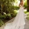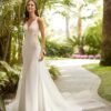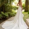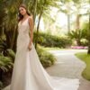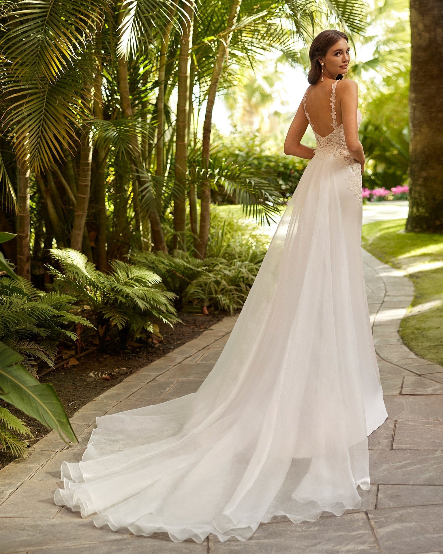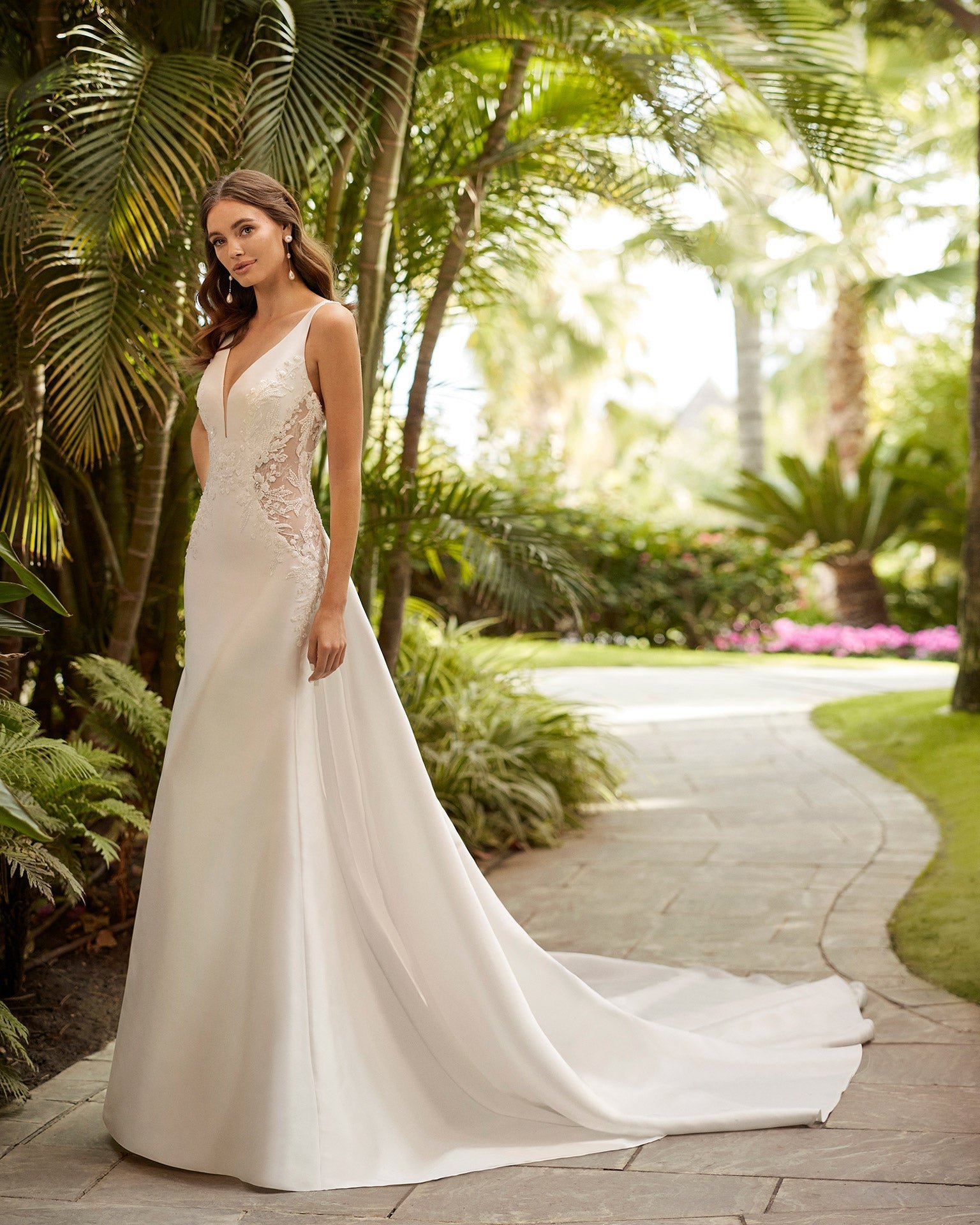 Sensuale abito da sposa sirena realizzato in crêpe elasticizzato con inserti di pizzo ricamato; scollo deep-plunge e schiena trasparente con dettaglio di bottoni e spalline con applicazioni in pizzo. Look Adriana Alier unico.