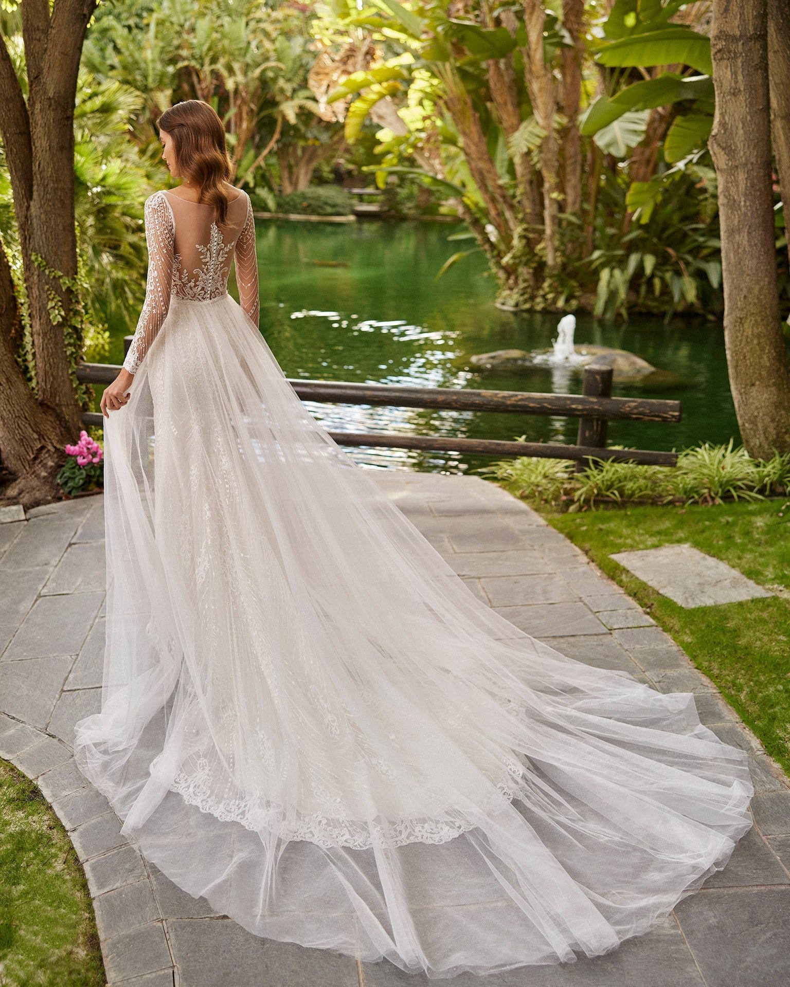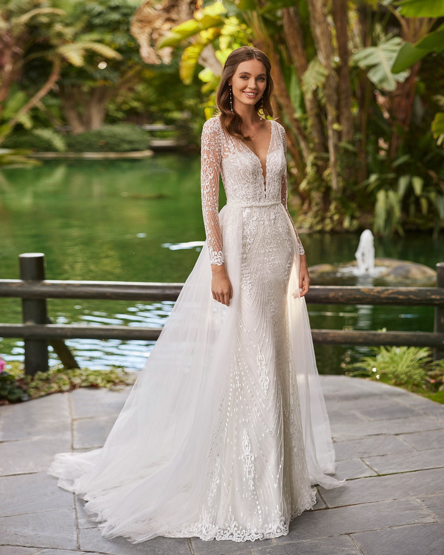 Abito da sposa sirena in stile barocco interamente realizzato in pizzo ricamato; scollo deep-plunge e schiena effetto illusione con dettaglio di bottoni e maniche lunghe. Look Adriana Alier unico con sopraggonna di tulle.