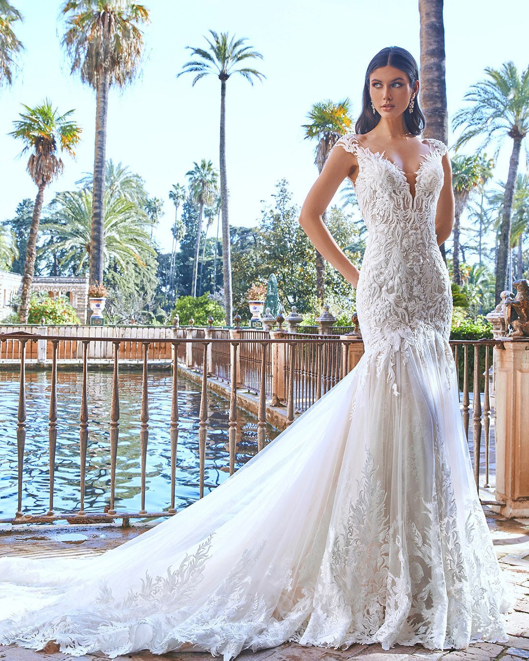 Bellissima sirena con scollo a V omerale con pizzo e ricami a rilievo, per una sposa sensuale che non lascia al caso i dettagli. La coda è realizzata in tulle, contornata da un importante pizzo soutache.
