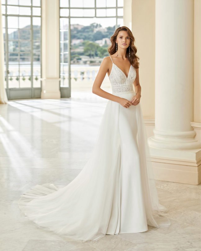 Il taglio a sirena dell’abito Idan è l’ideale per una cerimonia estiva. Si compone di un corpetto in pizzo con scollo a V e leggerissime spalline che apportano sensualità. Completa il look una magica gonna reversibile, che si integra perfettamente all’abito da sposa leggero in crêpe con la schiena scoperta disegnata da spalline incrociate.
