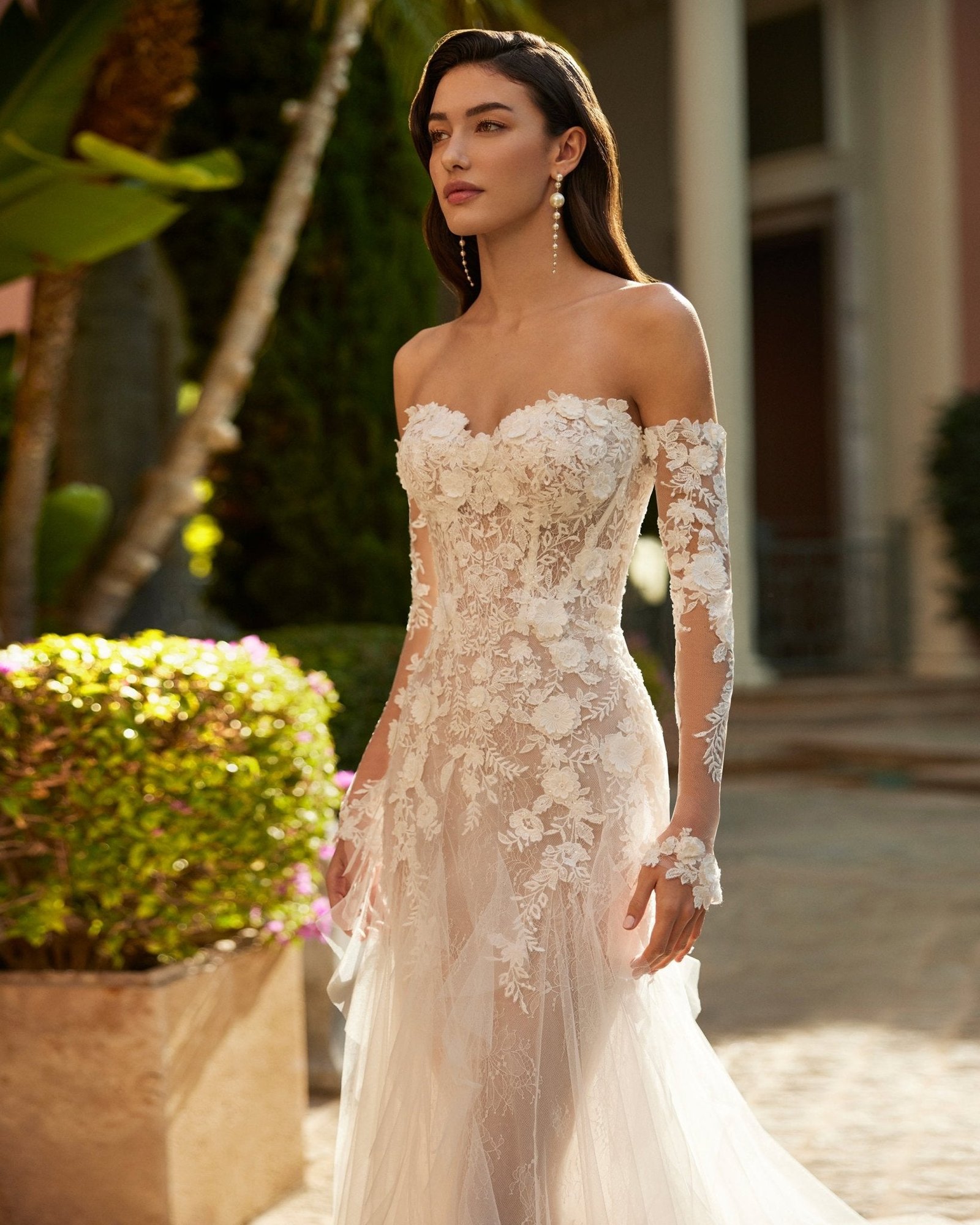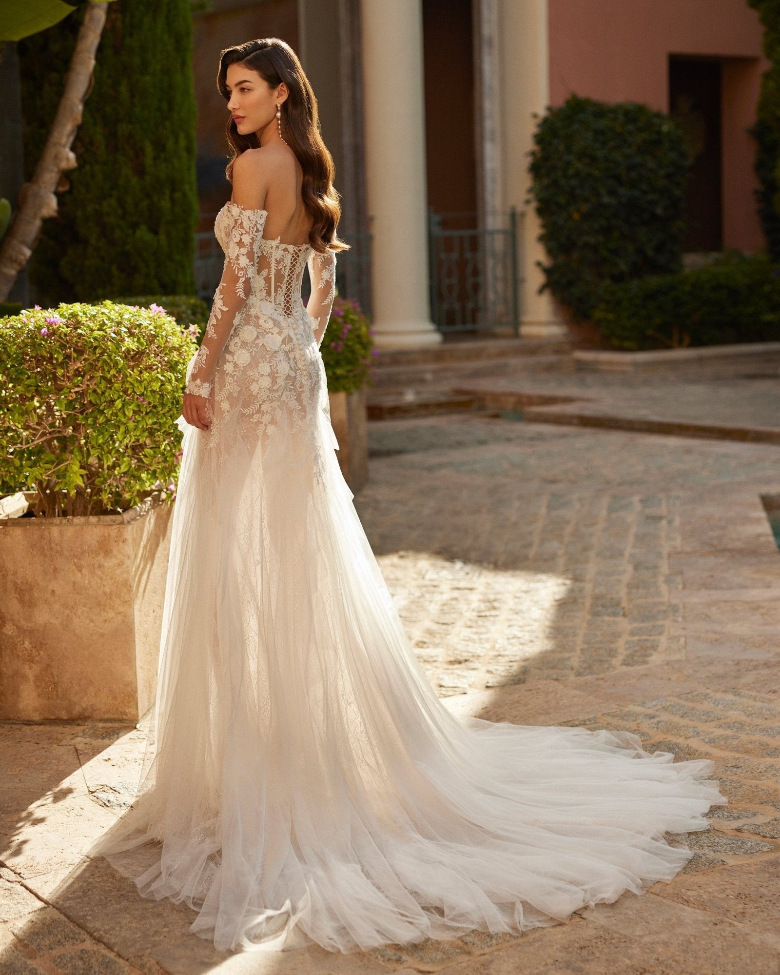 Abito da sposa sirena lungo in pizzo e tulle. Lo scollo a barchetta esalta con eleganza le spalle, mentre la schiena in stile corsetto dona un tocco romantico e seducente. Le maniche rimovibili completano il modello con versatilità, permettendo di adattare il look ai diversi momenti della giornata.