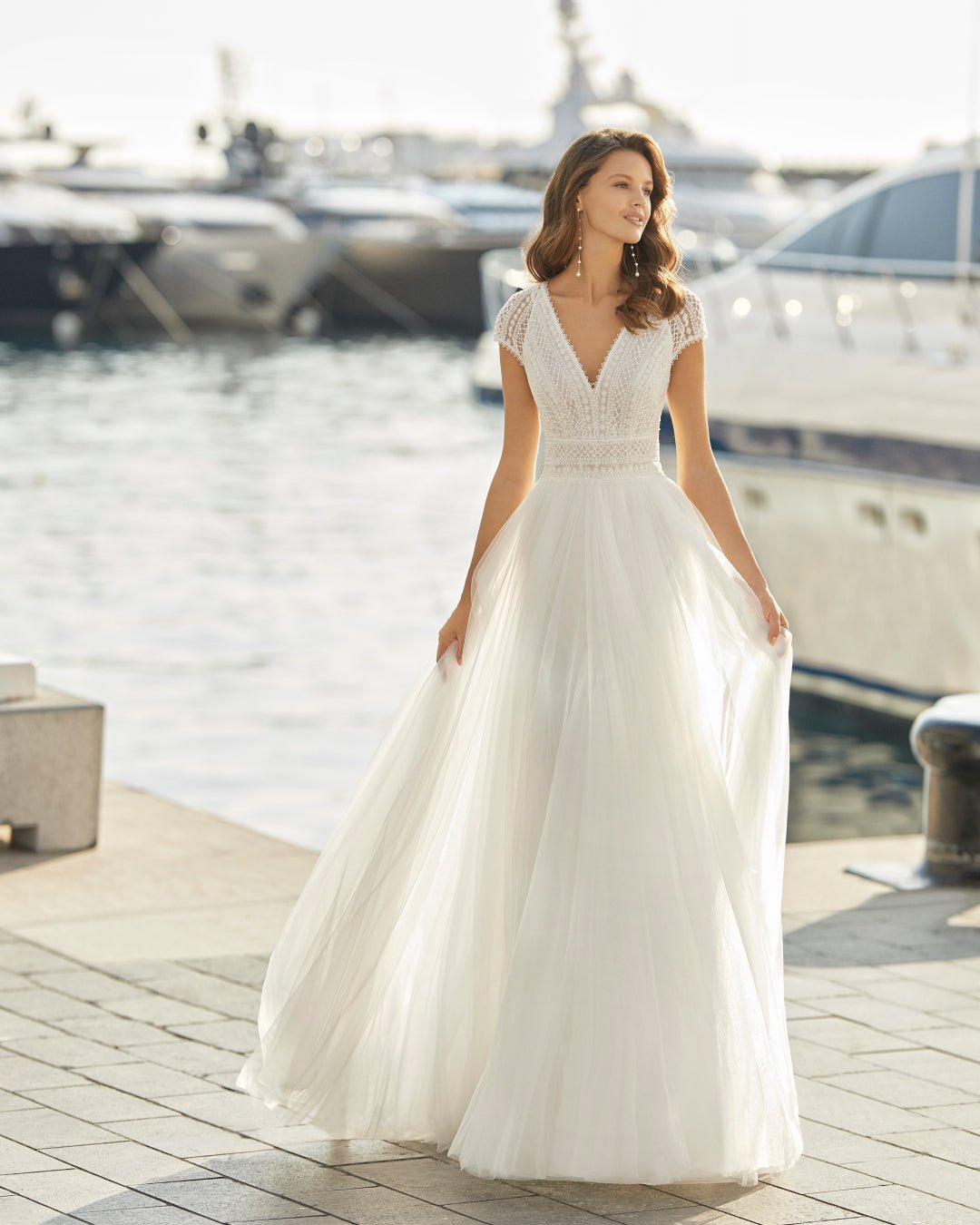 Indiana è un abito incantevole che catturerà tutti gli sguardi. Lasciati conquistare da questo romantico abito da sposa in stile principessa con un’incredibile gonna realizzata con strati e strati di tulle voluminoso e dal suo corpetto impreziosito da straordinari motivi in pizzo. Lo scollo a V è completato da maniche francesi e dall’effetto illusione sulla schiena. Questo è un abito perfetto per una cerimonia in autunno.