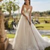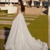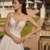 Abito da sposa redingote lungo, confezionato in pizzo e arricchito da un’ampia gonna in tulle. Il corpetto, caratterizzato da un profondo scollo sul davanti e da una schiena a V con sottili spalline, esalta la femminilità con eleganza. Un modello che unisce romanticismo e raffinatezza per un look da sogno.
