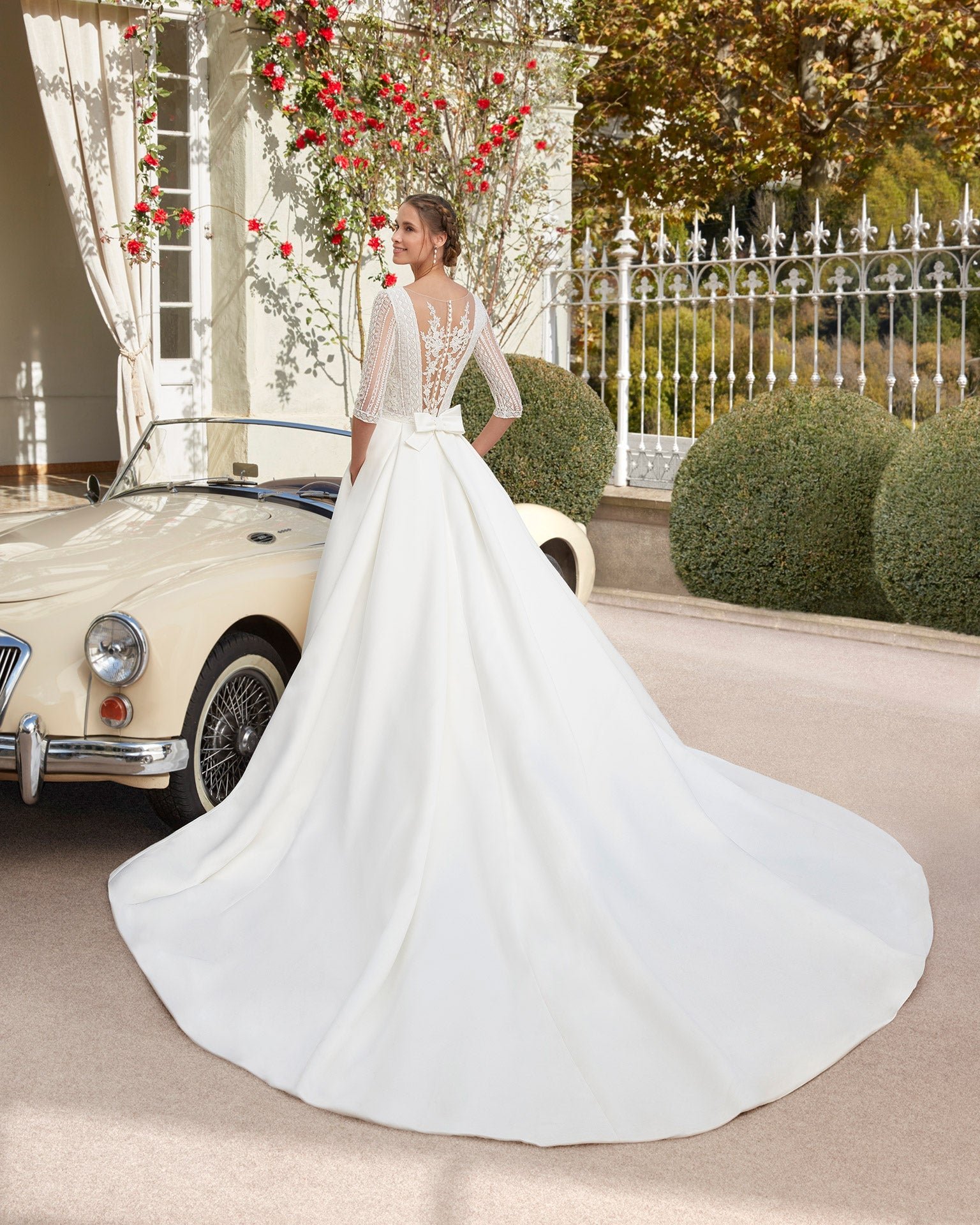 Magnifico abito romantico in mikado con scollo a v e schiena coperta da un fantastico ramage effetto tattoo.