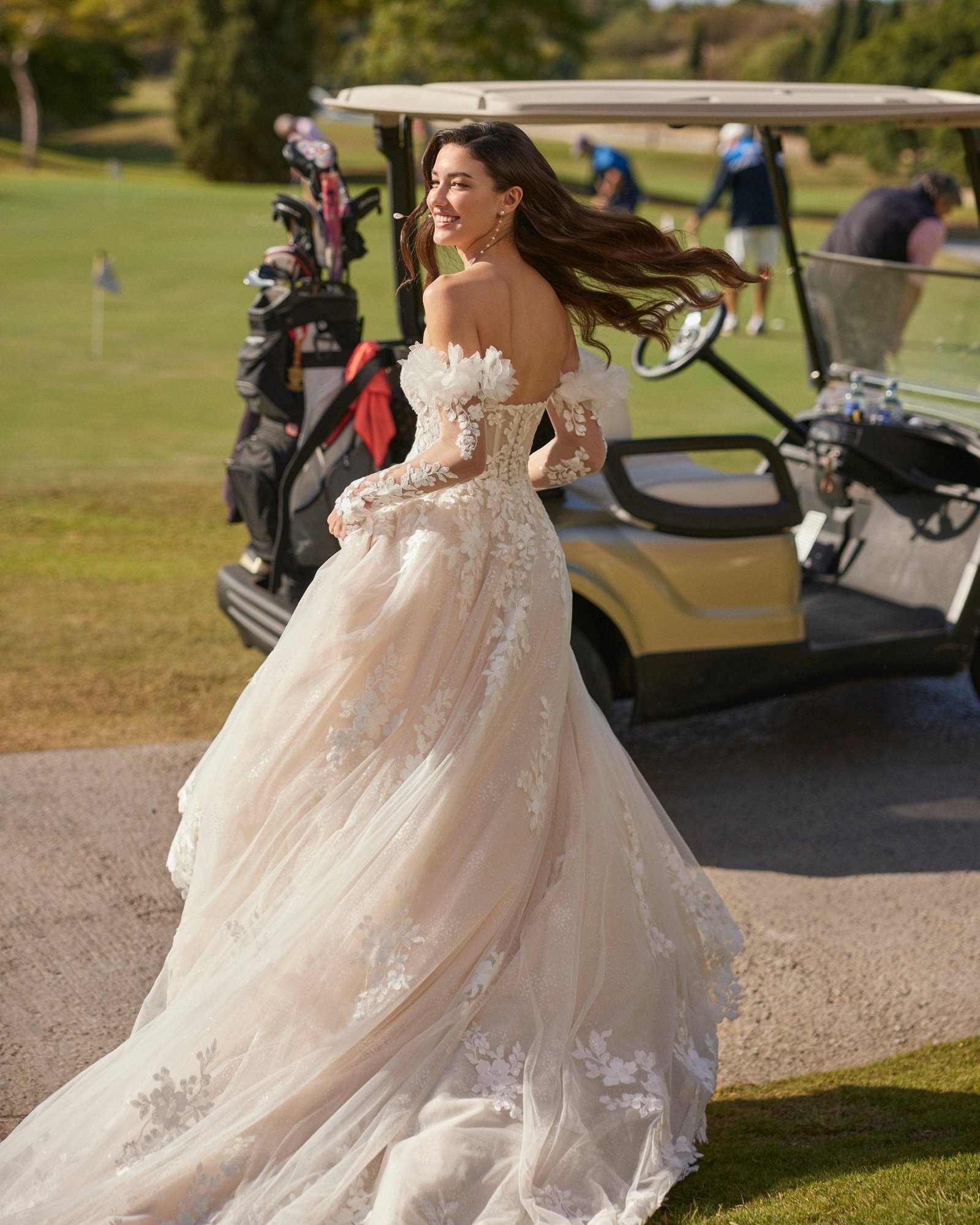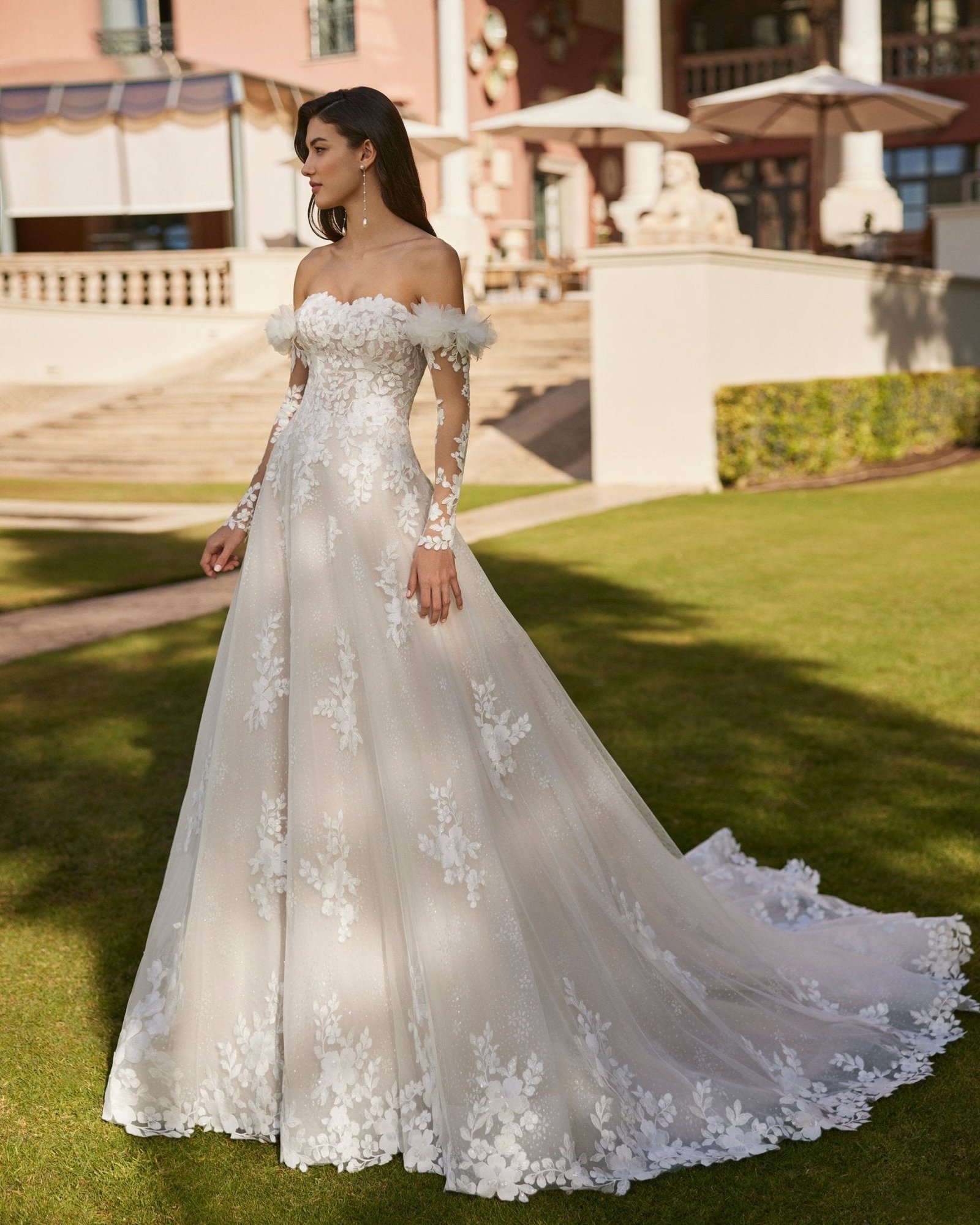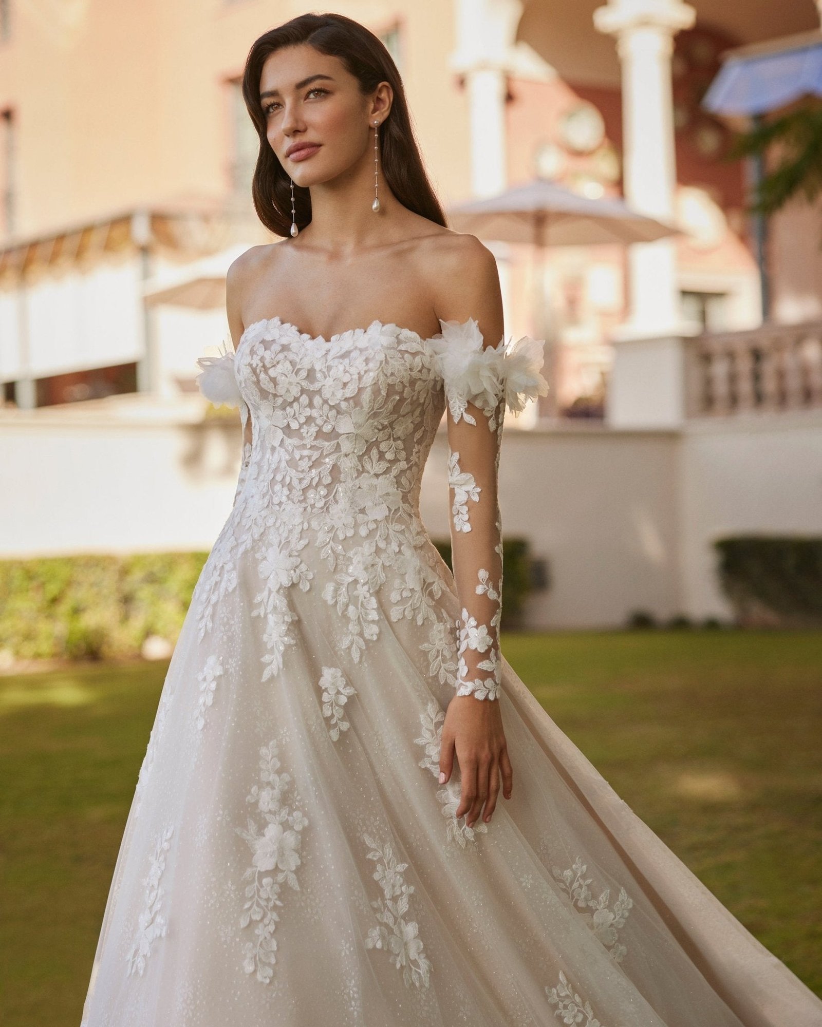 Abito da sposa ampio, confezionato in pizzo con ampia gonna in tulle. Il corpetto presenta un elegante scollo senza spalline che valorizza il décolleté, mentre la schiena chiusa con abbottonatura aggiunge un tocco classico e raffinato. Le maniche decorate con un delicato fiore ornamentale completano l’abito, regalando un dettaglio unico e femminile. Un modello fiabesco, pensato per la sposa che sogna un look regale e indimenticabile.