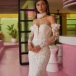 Un lussuoso abito a sirena in due pezzi, sapientemente lavorato con pizzo finissimo e scintillanti perline. Il corpetto sweetheart รจ completato da un choker coordinato e da maniche e mantella rimovibili, che consentono di creare molteplici look. La schiena scoperta aggiunge un tocco sensuale a un design altrimenti regale.