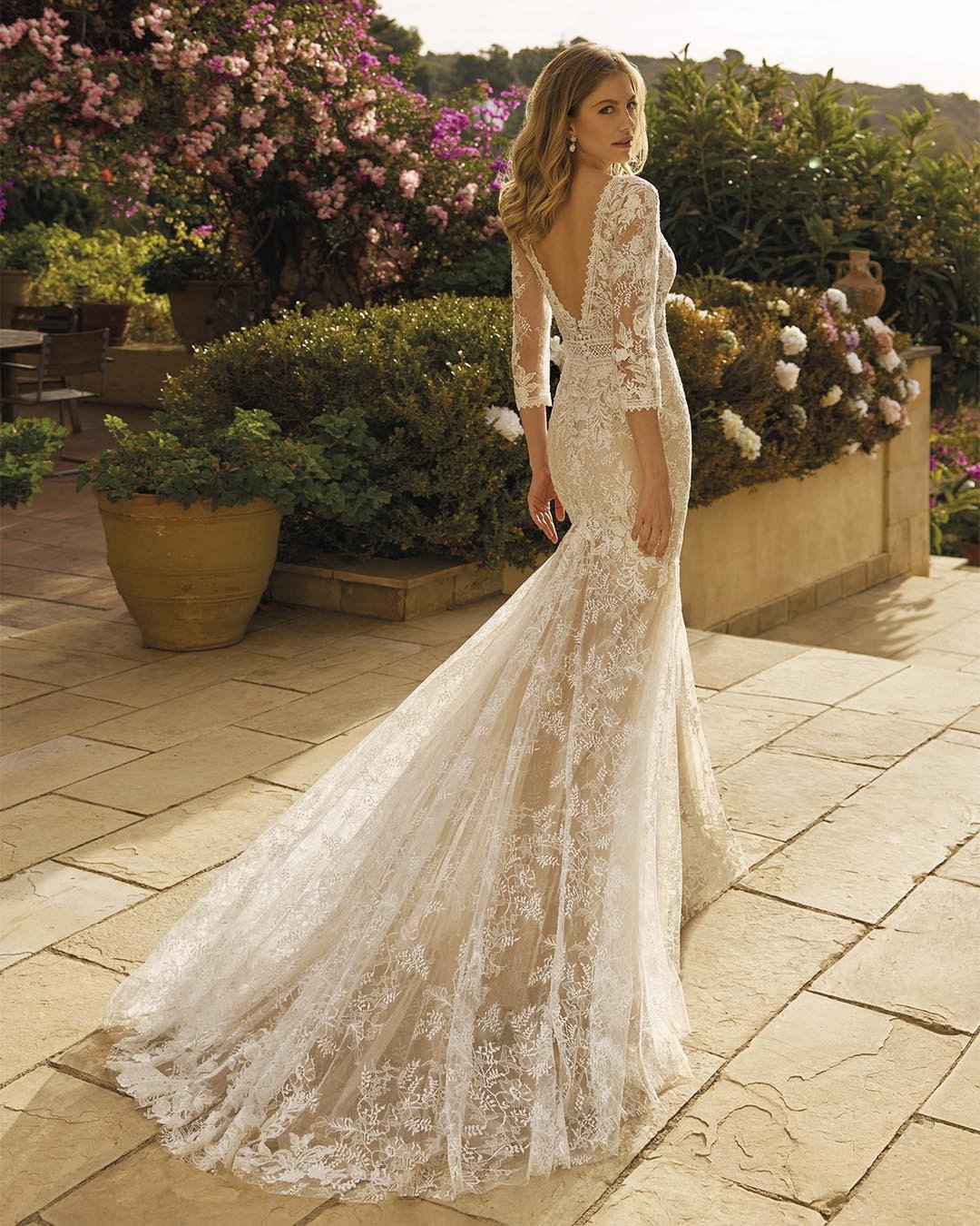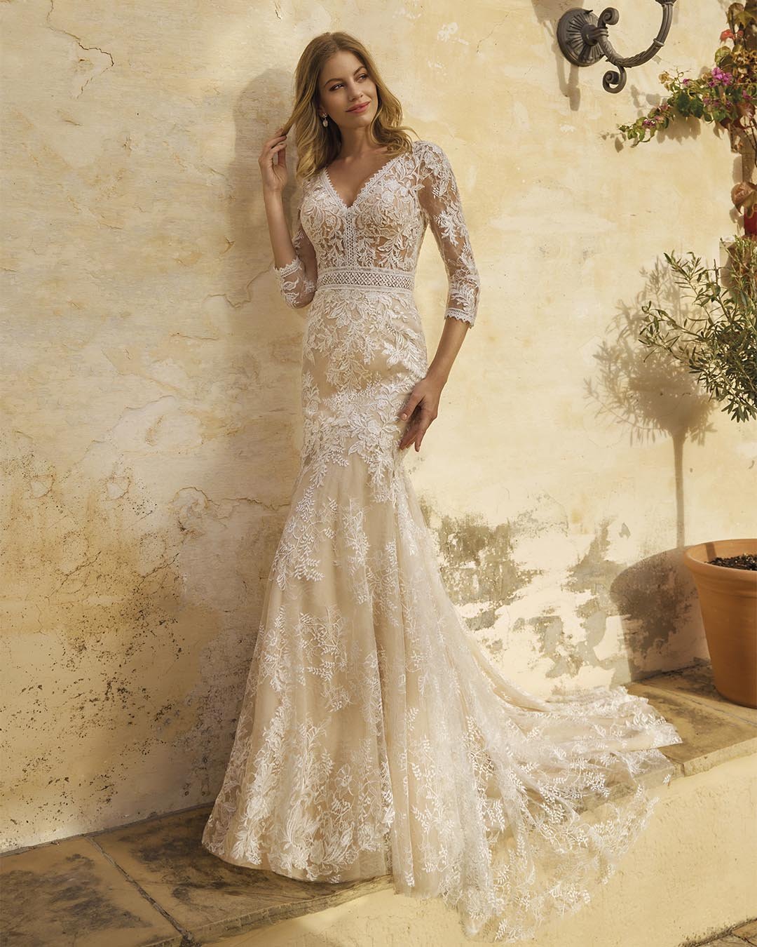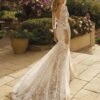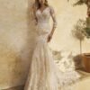 Abito da sposa in pizzo dalla linea sirena, interamente ricamato con motivi floreali raffinati. Il corpetto con scollo a V valorizza il décolleté, mentre le maniche a tre quarti aggiungono un tocco di eleganza e raffinatezza. La schiena a V e lo strascico fluido completano un look sofisticato e romantico, ideale per una sposa che desidera fascino e femminilità senza tempo.