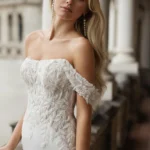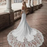 Una silhouette a sirena che celebra la figura, realizzata in liscio crêpe dalla caduta impeccabile. Lo scollo dritto è impreziosito da un choker coordinato e da eleganti spalline calanti. La parte posteriore è definita da una fila di bottoni delicati che conduce a un maestoso strascico in pizzo floreale. Perfetto per una sposa moderna e raffinata.