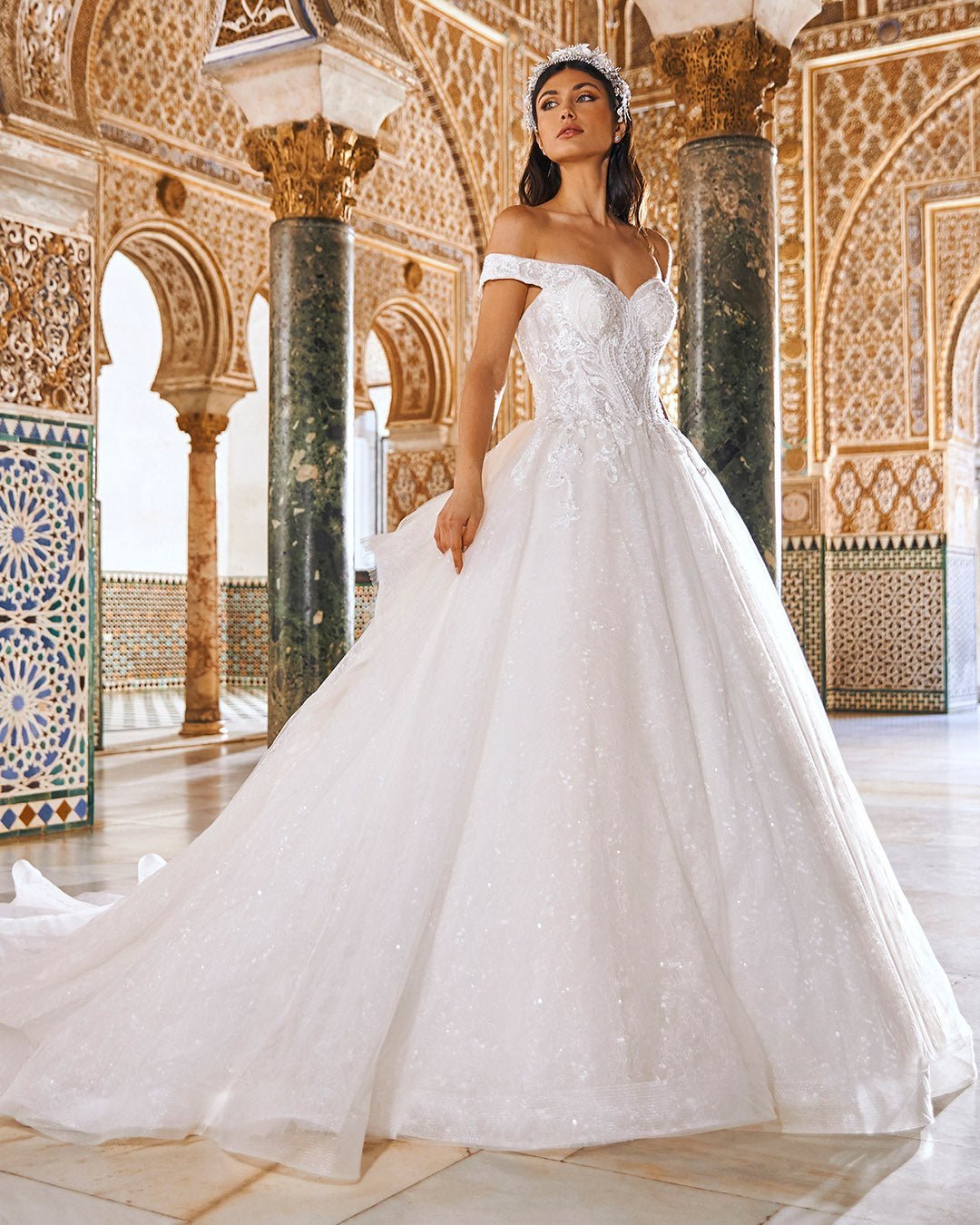 Maestoso abito principesco con corpetto scollo omerale e pizzo francese ricamato a mano, gonna ball gown con pizzo ombra e particolari balze che lo rendono esclusivo.