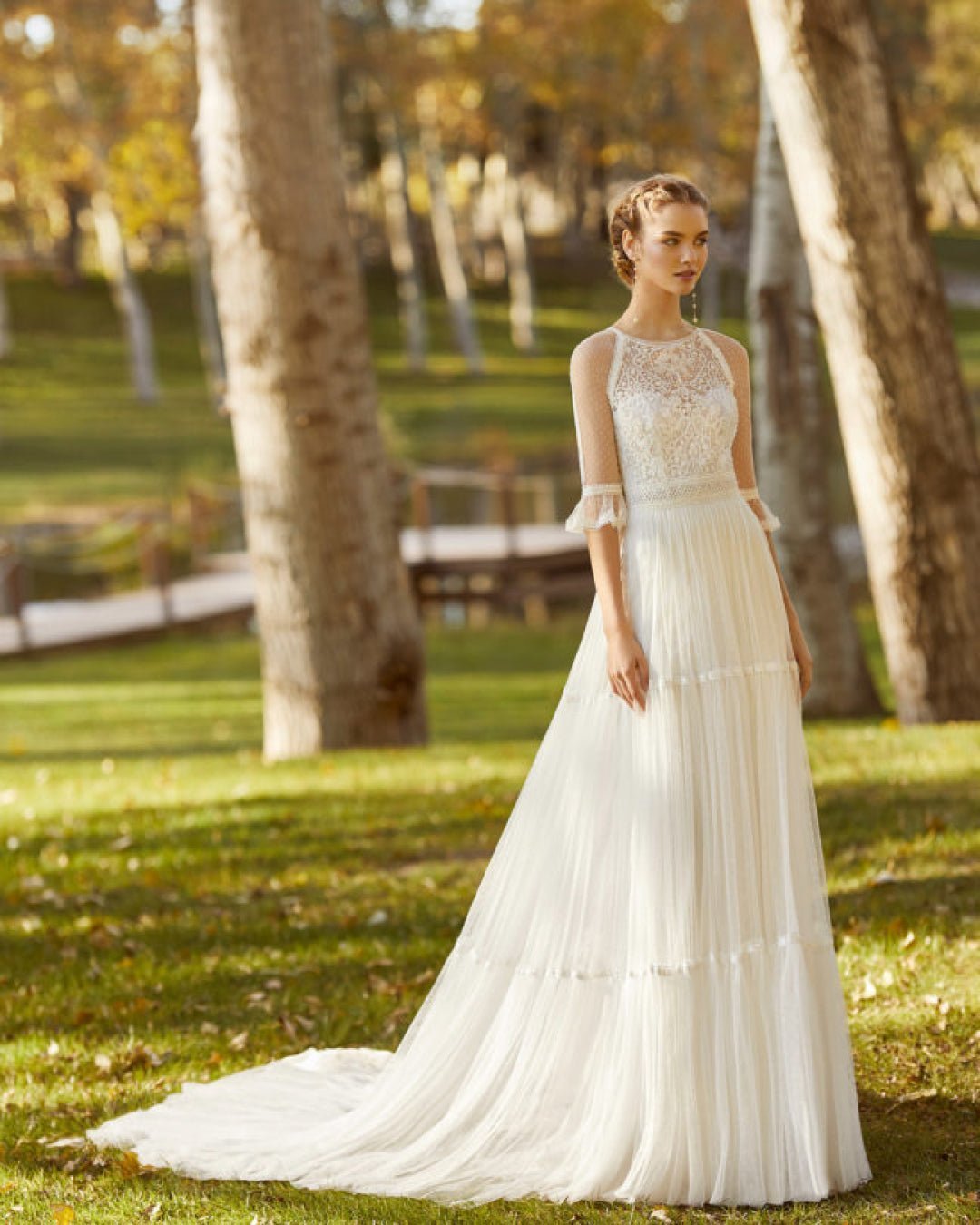 Kimba è un abito ricco di dettagli, in cui i ricami in pizzo del corpetto e le linee dritte del modello si fondono alla perfezione. È confezionato in tulle e presenta uno scollo rotondo e maniche francesi, perfette per una cerimonia in autunno o per un matrimonio religioso. Se hai sempre sognato di indossare un abito boho-chic, Kimba, con l’ampia scollatura sulla schiena, è quello giusto per te.
