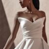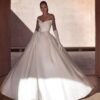 Abito da sposa in stile principessa, confezionato in mikado in seta con pieghe strutturate. Il modello senza spalline e senza maniche valorizza qualsiasi silhouette con eleganza, mentre i lunghi guanti bianchi aggiungono un tocco raffinato e scenografico. Lo strascico di 180 cm completa l’abito con maestosità.