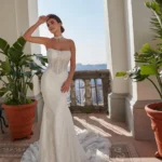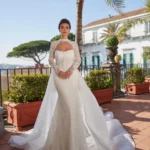 Un abito che vive di due anime: la sensuale linea a sirena in pizzo tattoo-effect per il ricevimento, e l’aggiunta della sopragonna rimovibile in tulle per un ingresso regale. Arricchito da un bolero in pizzo a collo alto, รจ l’incarnazione della doppia eleganza per un matrimonio in grande stile.