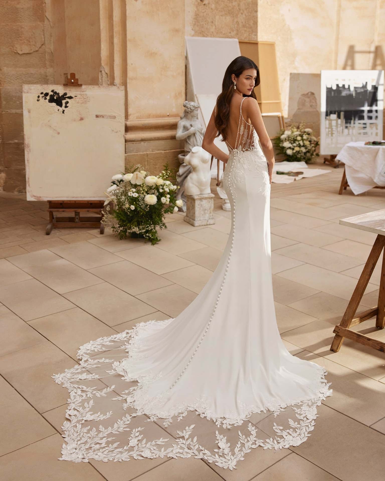 Abito da sposa a sirena in crêpe. Il corpino in pizzo ricamato con perline esalta la silhouette con raffinatezza, mentre lo scollo a V e le spalline slanciano la figura con eleganza. La schiena scoperta aggiunge un tocco sensuale e moderno, completando un modello che unisce romanticismo e sofisticata femminilità.