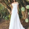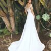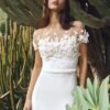 Questa morbida e classica silhouette ad A è stata totalmente trasformata con un corpetto fantasia incastonato con applicazioni floreali 3D e carré in tulle nudo.