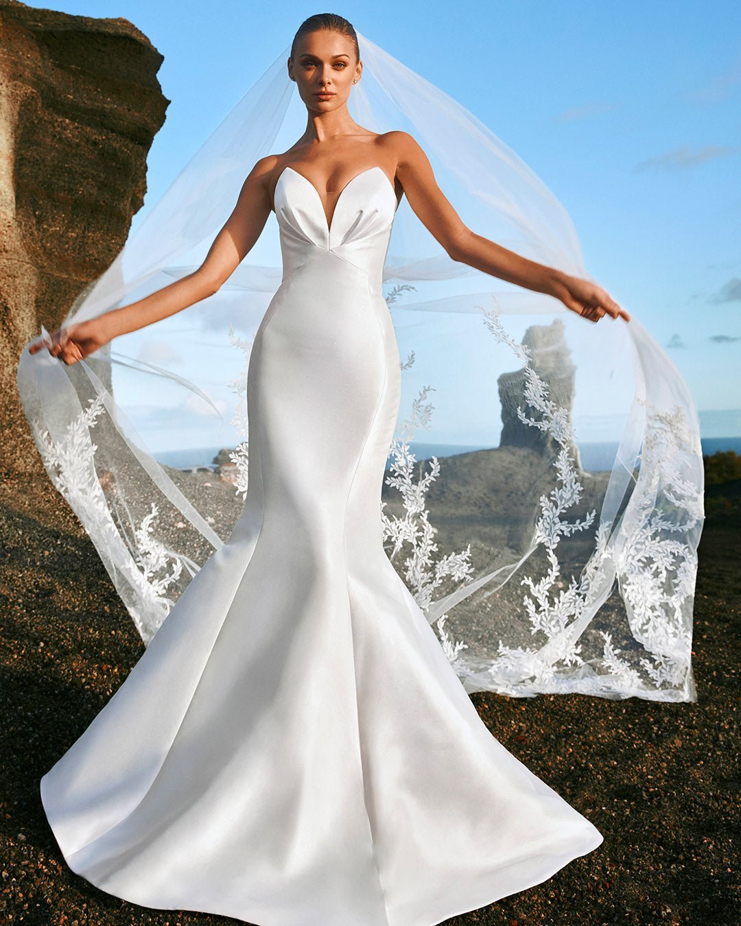 Un abito da sposa mozzafiato a sirena in mikado in seta strutturato. Con formazioni simili a petali sulla scollatura e una gonna a coda di pesce che fa davvero una dichiarazione. Perfetto per l’abbinamento con veli decorati e gioielli audaci.