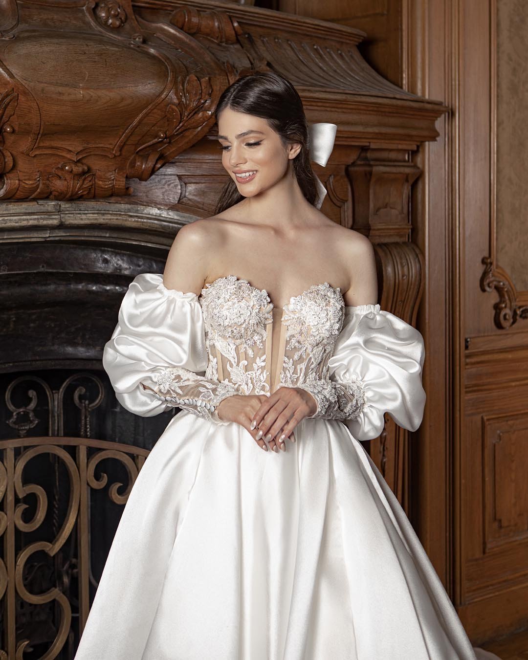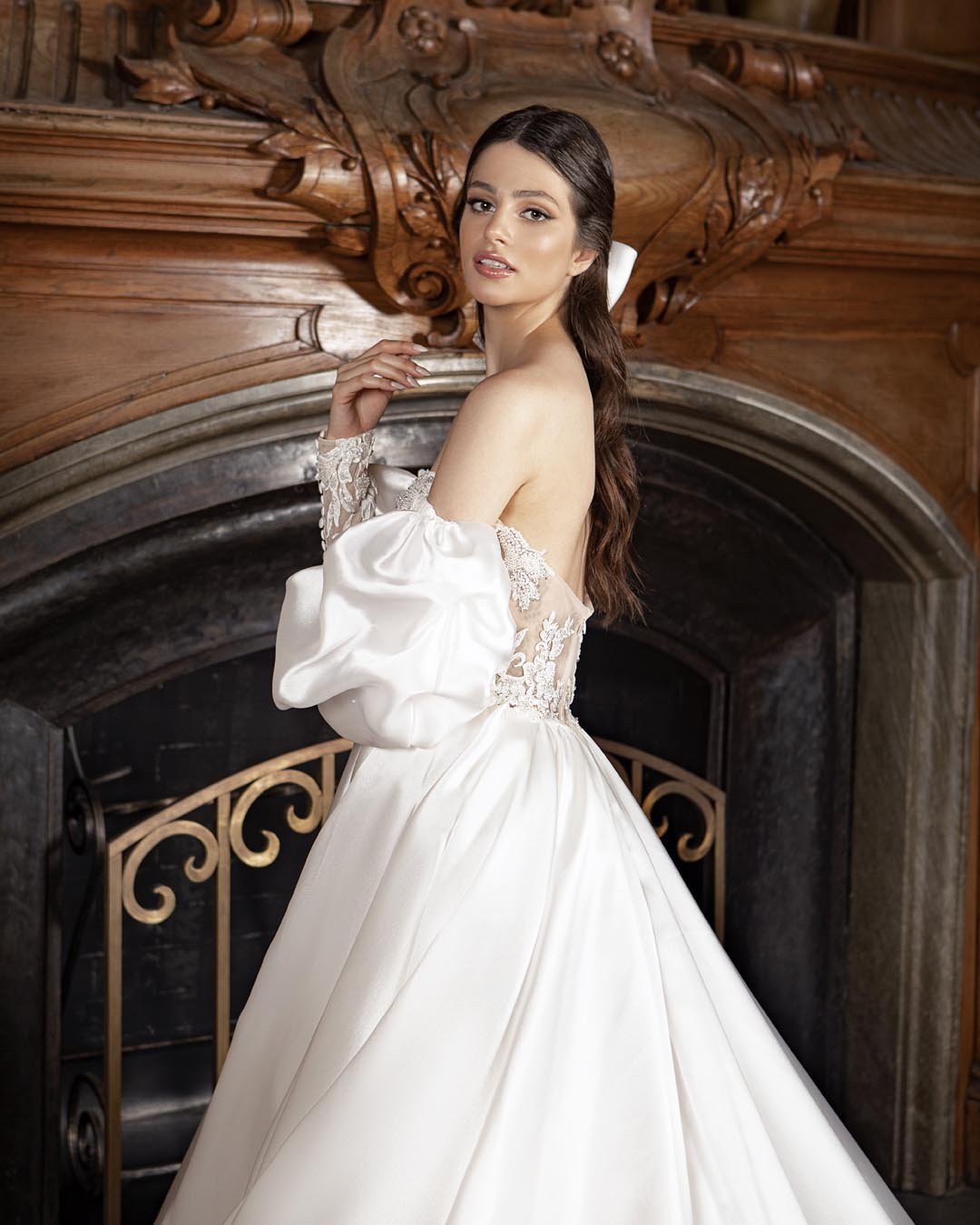 Abito da sposa romantico e sofisticato, realizzato con un prezioso corpetto in pizzo ricamato, impreziosito da perline e dettagli luminosi che donano un tocco di glamour. La vita segnata valorizza la silhouette, mentre la gonna in organza in seta scivola leggera sui fianchi e cade fino a terra con grazia. Il retro sorprende con una profonda scollatura e una raffinata fila di bottoncini che aggiungono un tocco vintage ed elegante.