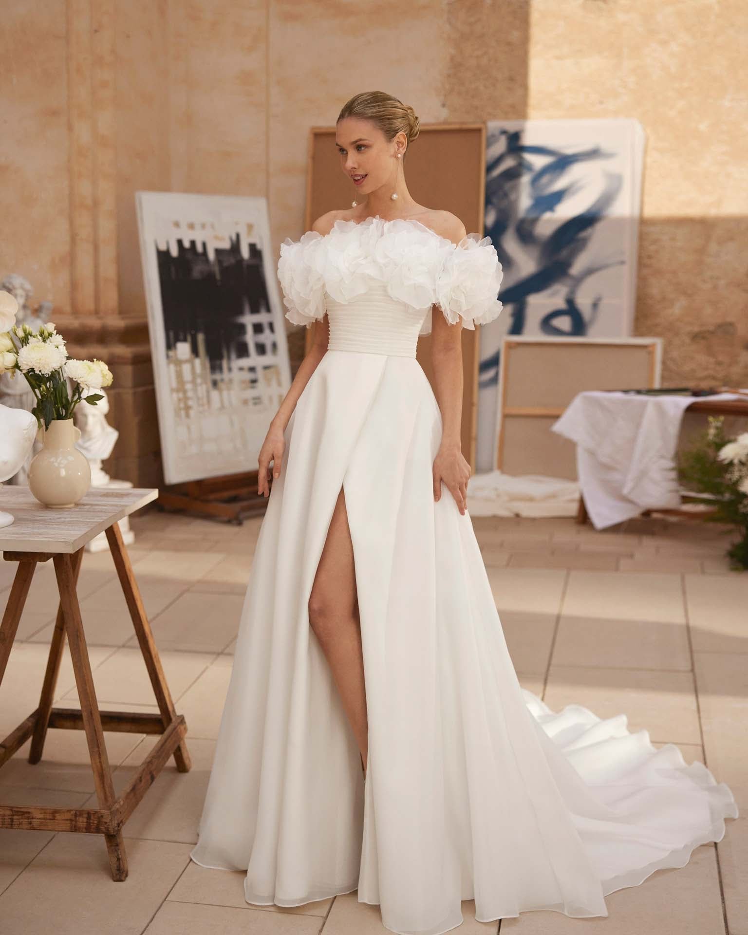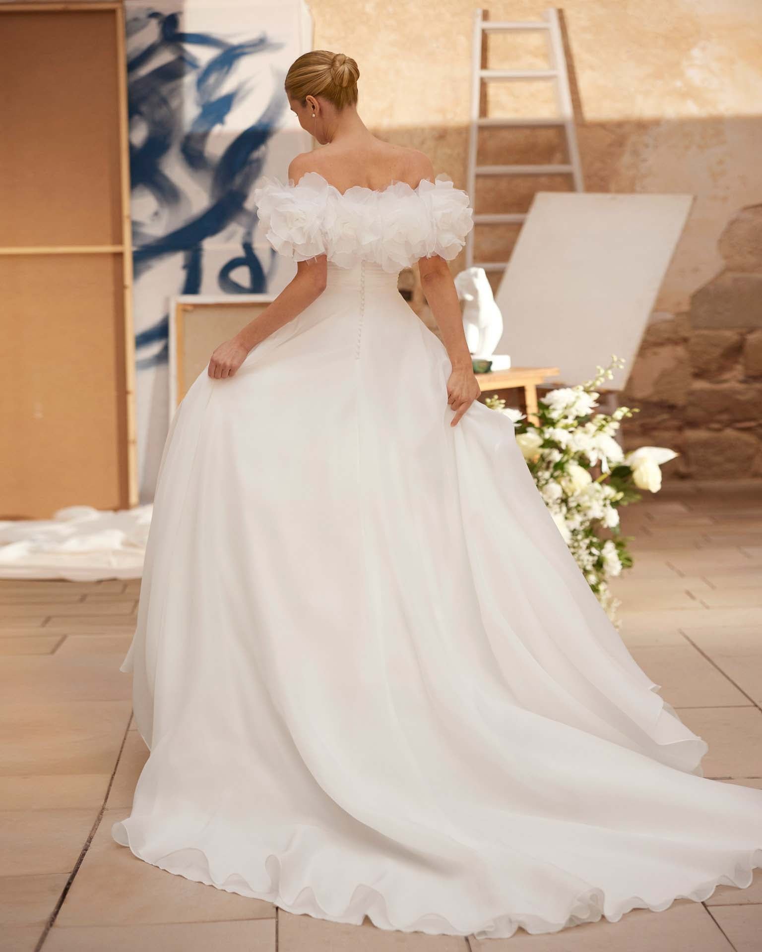 Abito da sposa dal taglio voluminoso in organza in seta. Lo scollo omerale incornicia con delicatezza le spalle, mentre la gonna ampia con spacco laterale aggiunge movimento e sensualità. Il colletto removibile completa il look con un dettaglio originale e sofisticato, offrendo alla sposa la possibilità di personalizzare il proprio stile. Un modello che unisce eleganza regale e modernità.