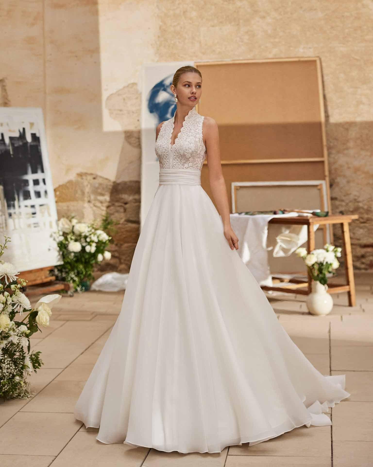 Abito da sposa redingote dall’eleganza intramontabile, realizzato in organza in seta leggera con un prezioso corpino in pizzo arricchito da perline scintillanti. Lo scollo a V slancia la figura, mentre la schiena chiusa aggiunge un tocco di sobrietà raffinata. Un modello che esalta la femminilità con grazia e romanticismo.