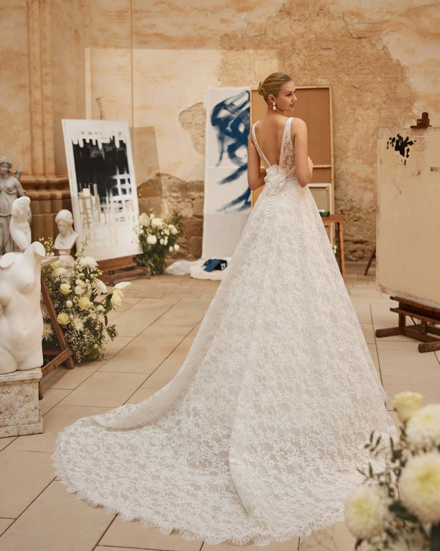 Abito da sposa dal taglio voluminoso in raffinato pizzo rebrodé. Lo scollo all’americana incornicia con eleganza le spalle e il décolleté, mentre la schiena scoperta dona un tocco sensuale e moderno. Un modello che unisce romanticismo e maestosità, ideale per la sposa che sogna un look regale e indimenticabile.