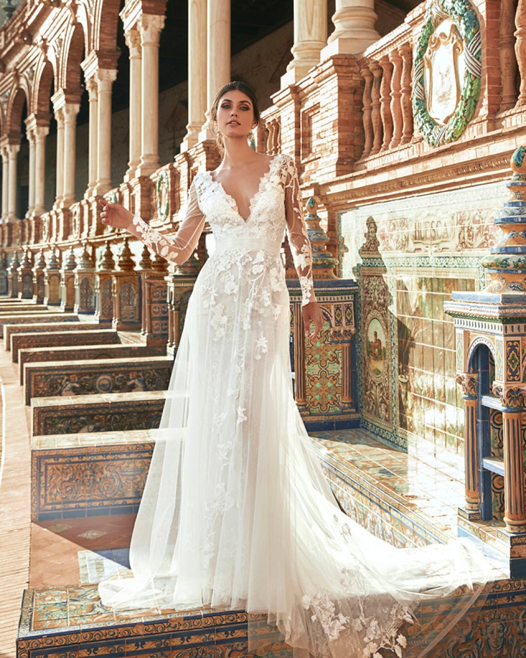 Un abito a tubino molto confortevole che asseconda ogni movimento. Pregiati ricami sui delicati motivi in tulle del corpetto, raffinate maniche ad angelo e gonna a strati. Con un delizioso fiocco posteriore che copre la zip creando una linea femminile sui glutei.