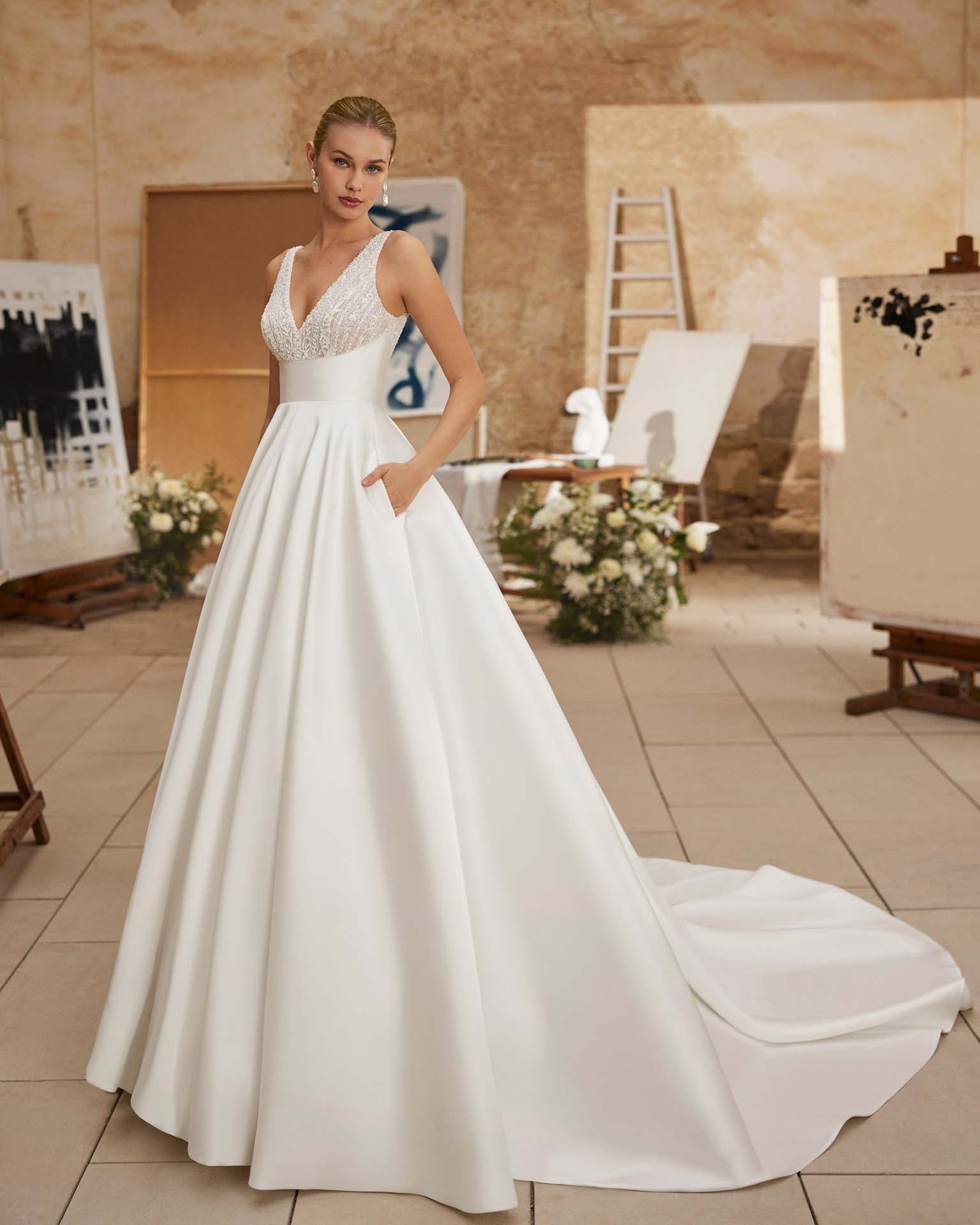 Abito da sposa con silhouette ampia a linea A, realizzata in pregiato mikado in seta, regala struttura e fluidità, accompagnando con grazia ogni movimento. Il corpetto, impreziosito da pizzo e delicate perline, crea un raffinato gioco di texture con un tocco di luminosità e sofisticata eleganza.