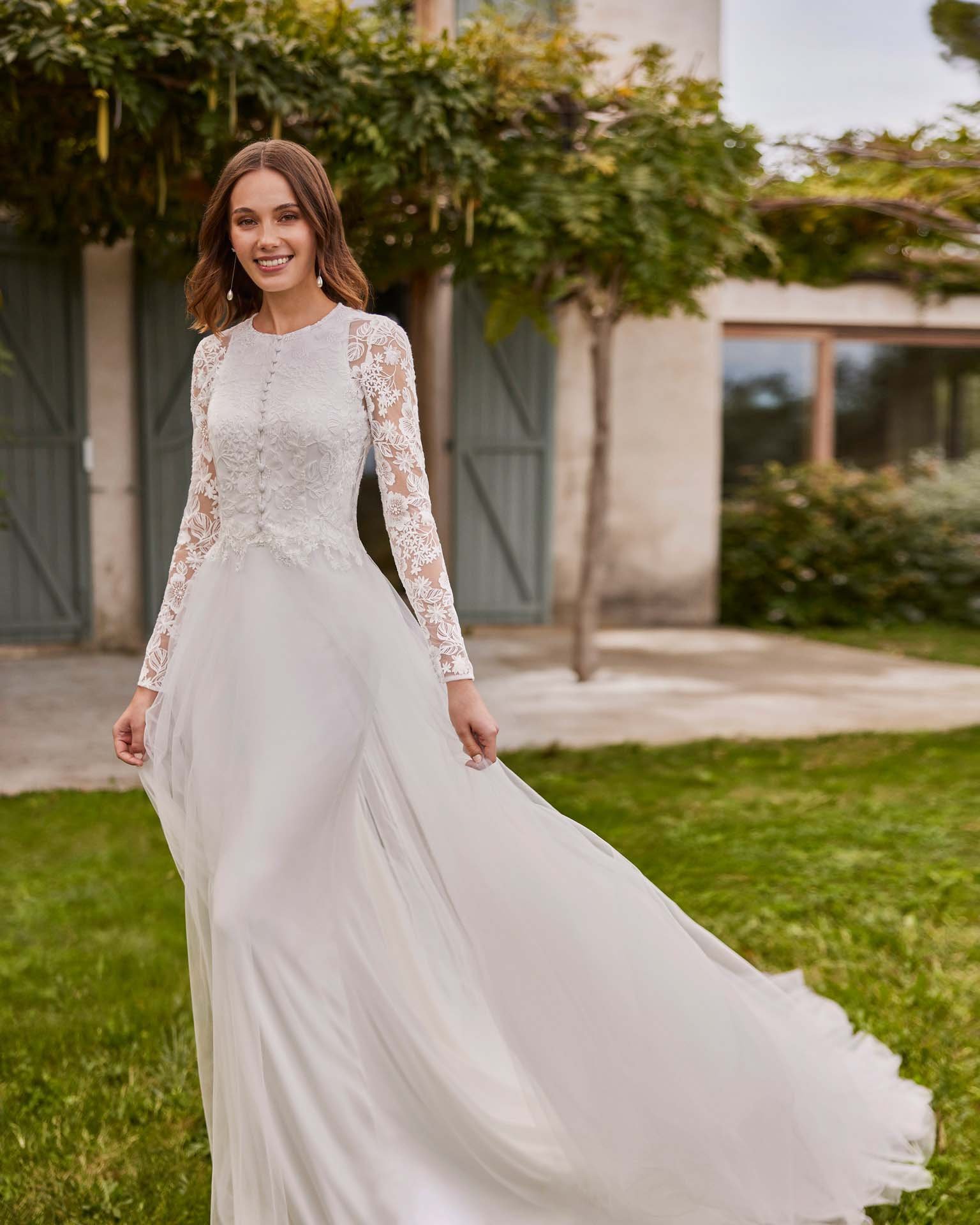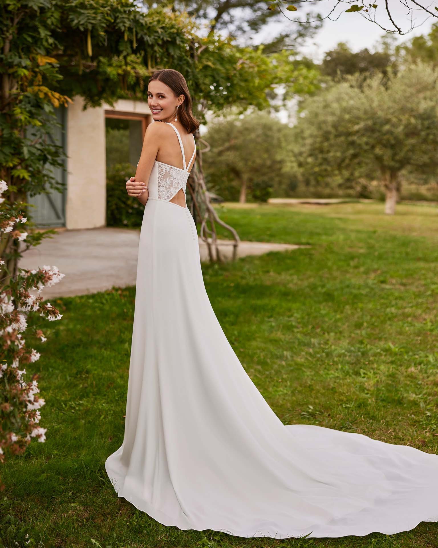 Abito da sposa lungo in due pezzi dal taglio dritto. Realizzato in raffinato crêpe, presenta un elegante scollo halter con spalline sottili e una schiena impreziosita da romantici inserti in pizzo. Completa il look una delicata giacca in pizzo, che dona un tocco di raffinatezza e versatilità.