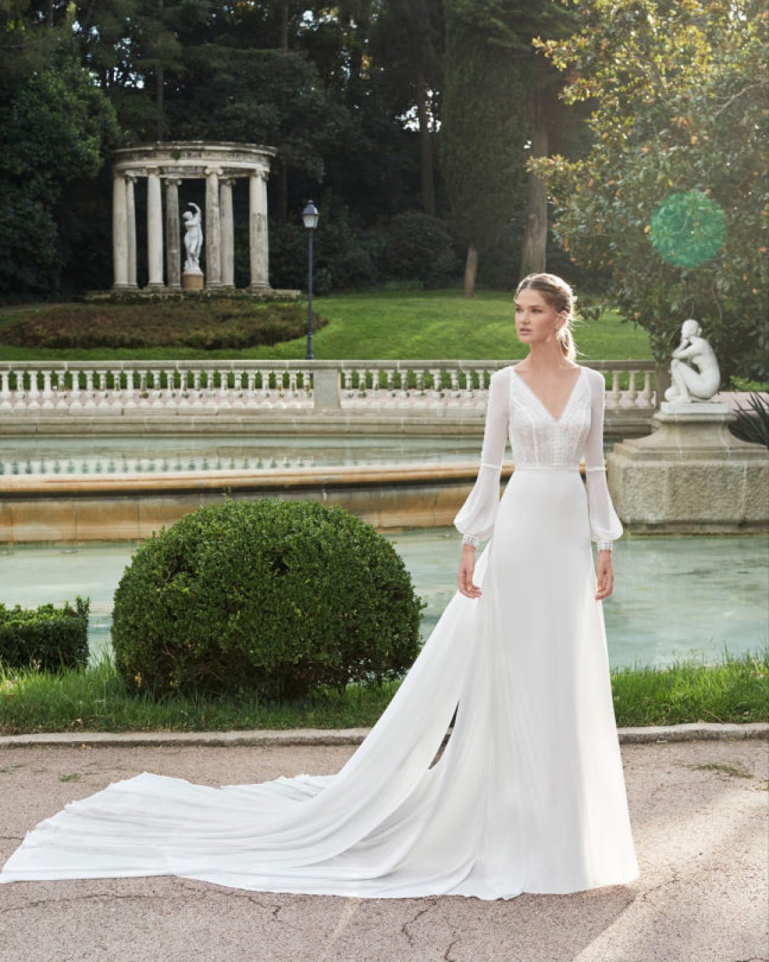 Abito da sposa di taglio dritto in georgette elastico e pizzo.
