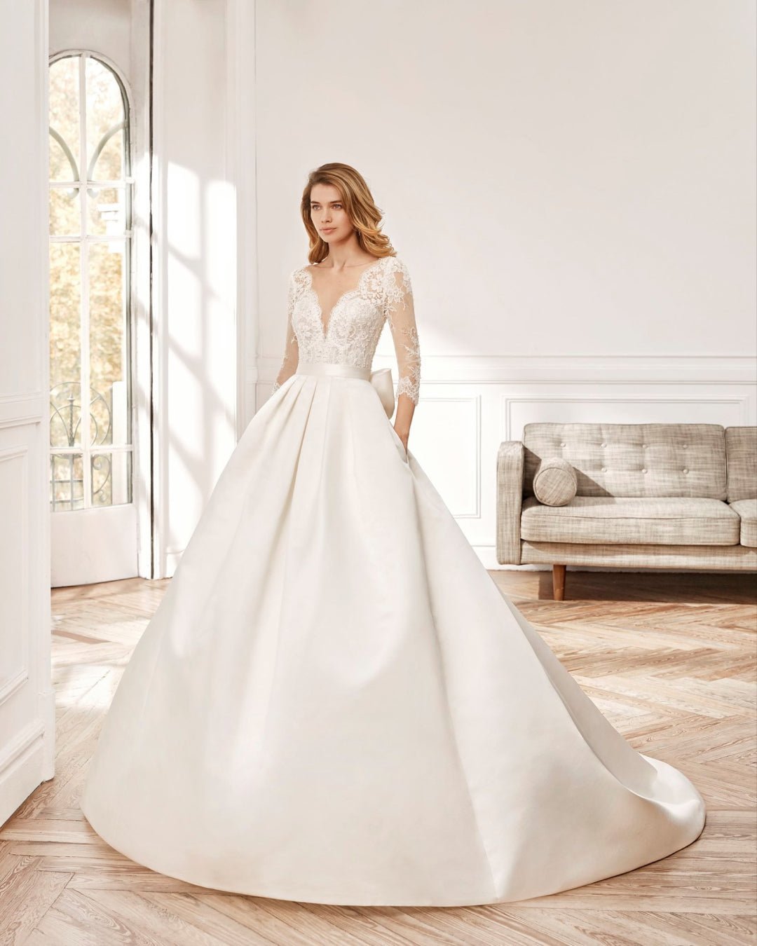 Abito da sposa trasformabile con sopragonna in stile classico su crepe stile tubino. Con sopragonna in raso duchesse, corpetto in pizzo con strass e maniche a tre quarti.