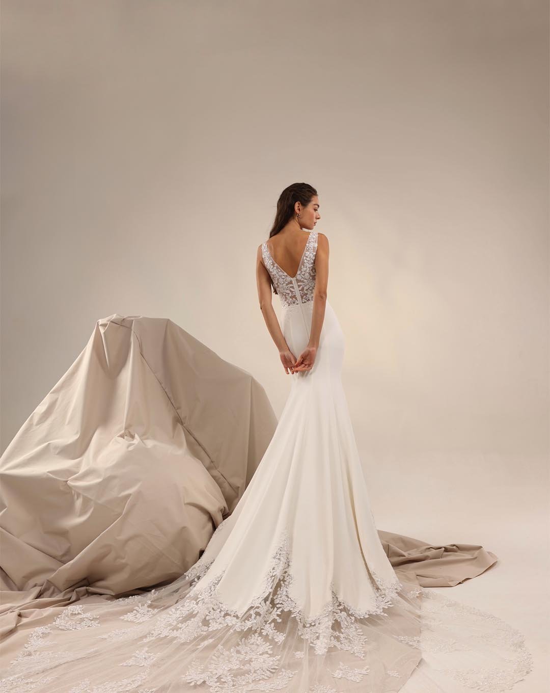 Abito da sposa lungo dallo stile minimal e raffinato. Realizzato in crêpe, pizzo e ricami con paillettes e perline, unisce linee pulite ed eleganza senza tempo. La silhouette aderente e i delicati dettagli in pizzo regalano un tocco di luce e modernità.