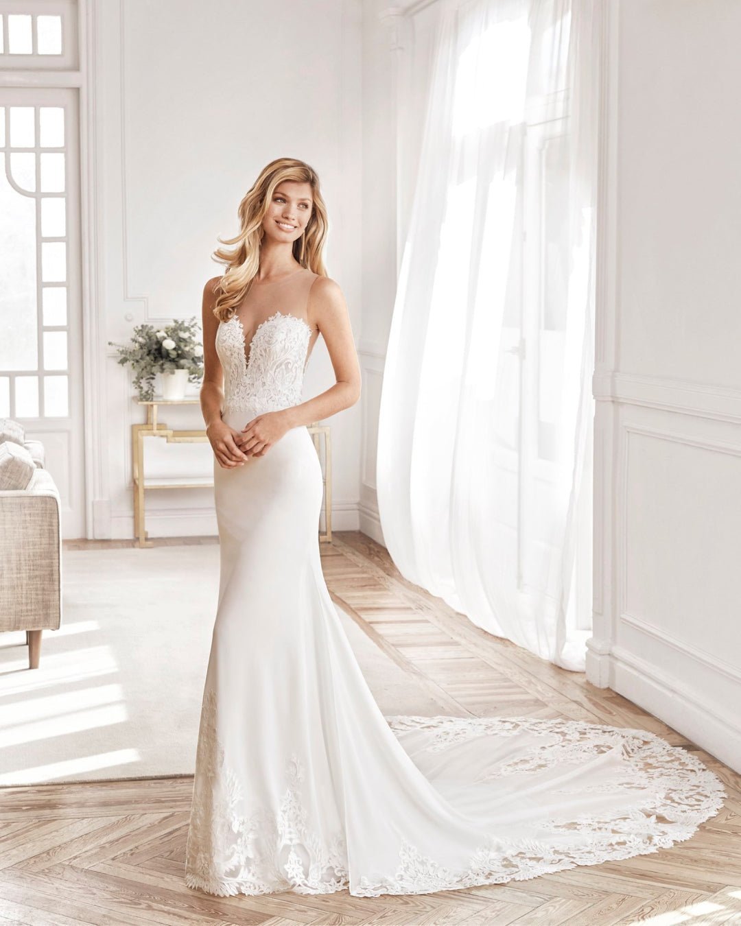 Abito da sposa a tubino in georgette stretch di crepe e pizzo. Scollo illusione e retro in pizzo.