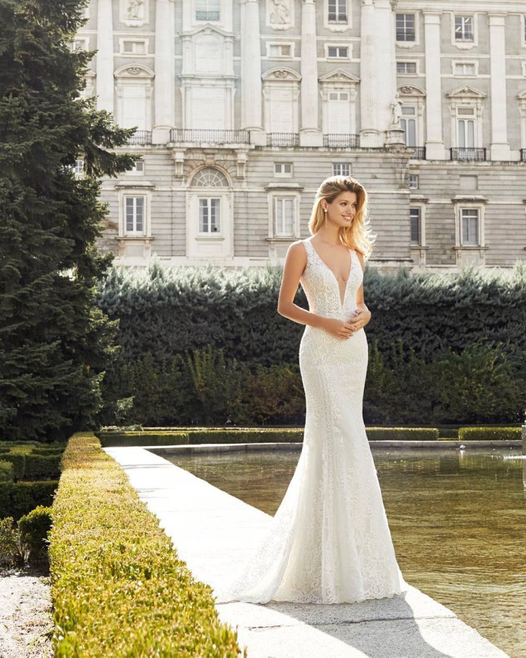 Abito da sposa stile tubino con pizzo di perline e orlo smerlato. Caratterizzato da profondo scollo a V e scollo profondo sulla schiena con bottoni ricoperti di raso. Abito da sposa della collezione Aire Barcelona.