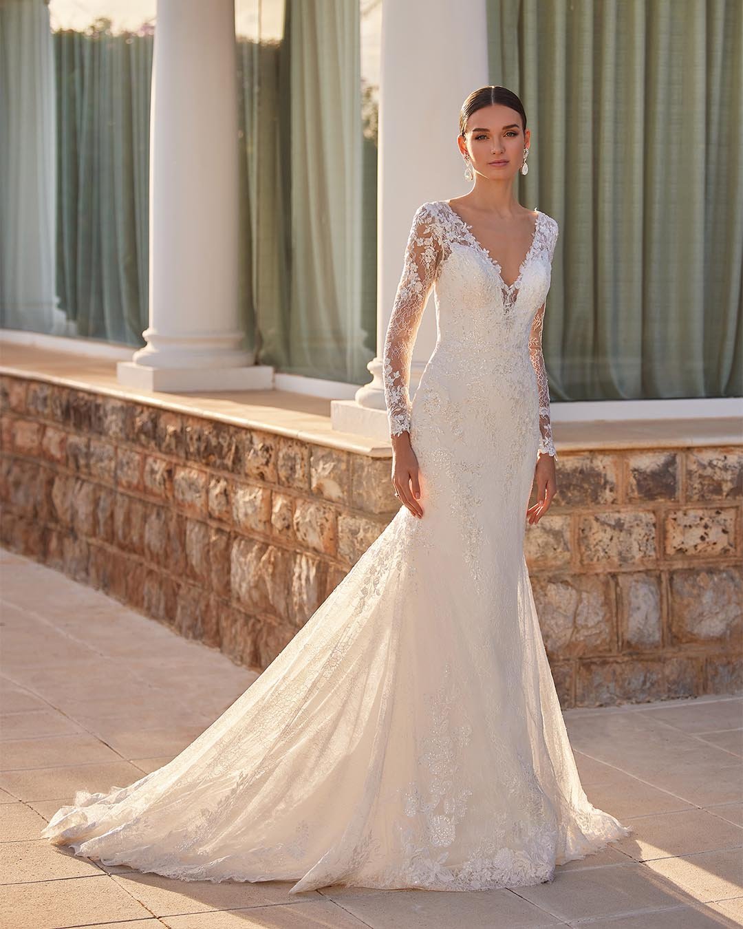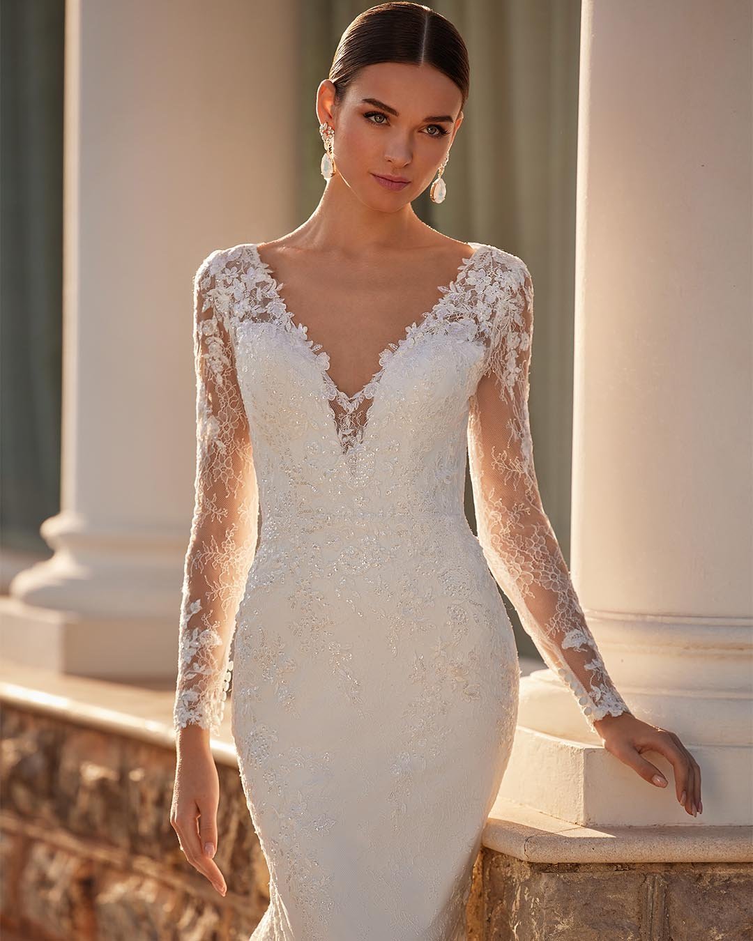Abito da sposa sirena interamente realizzato in pizzo, con scollo a V e maniche lunghe effetto tattoo. La scollatura profonda, sia sul davanti che sulla schiena, valorizza la femminilità con eleganza, mentre il taglio posteriore scolpisce le curve in modo raffinato e sensuale.