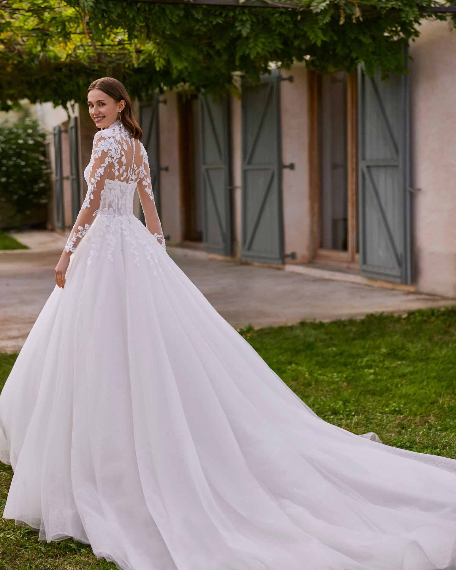 Abito da sposa lungo a due pezzi in linea A, confezionato in tulle e pizzo. Il corpetto senza spalline esalta la femminilità con delicatezza, mentre la giacca in pizzo aggiunge un tocco di raffinatezza ed eleganza senza tempo. Un modello romantico e versatile che valorizza ogni silhouette.