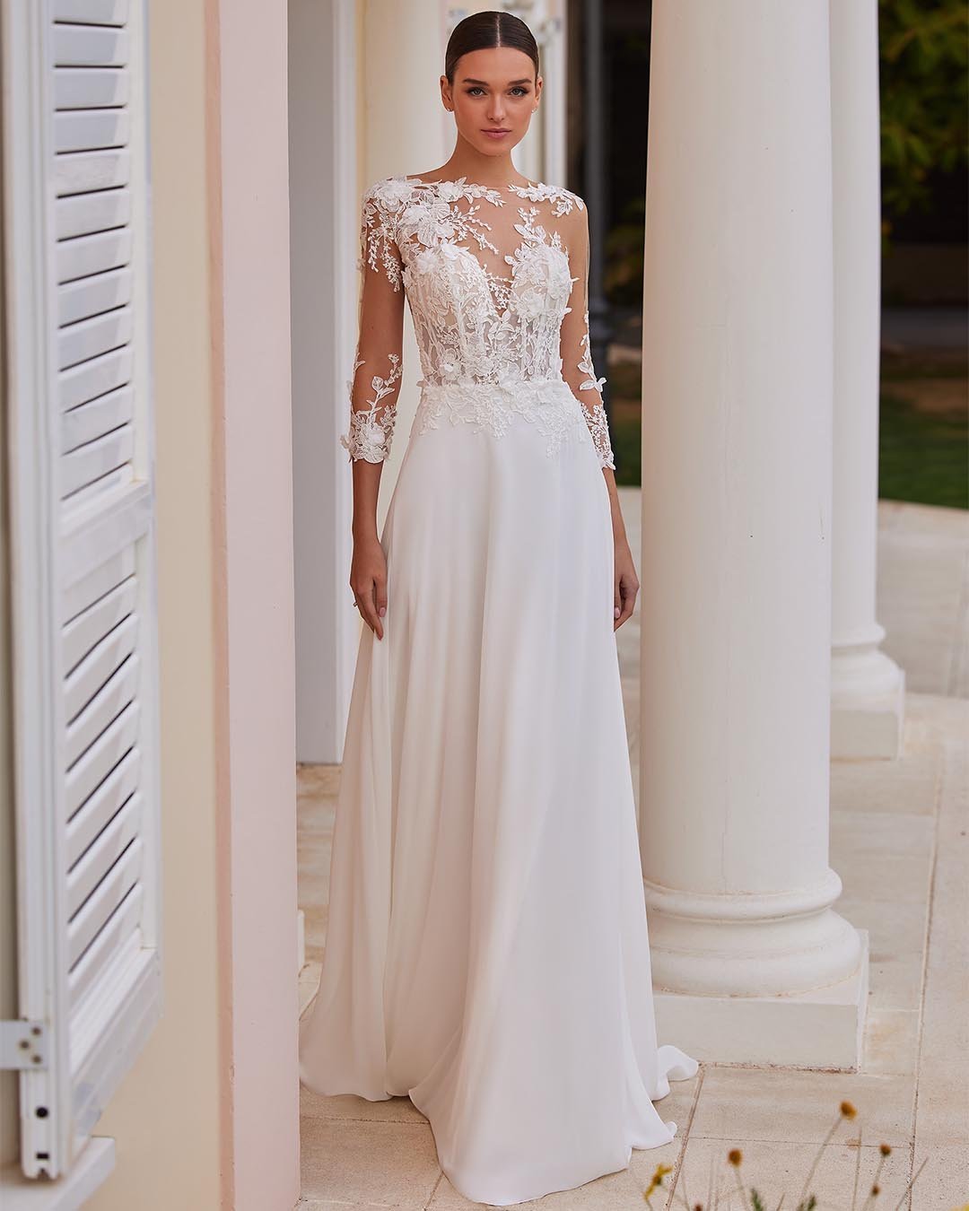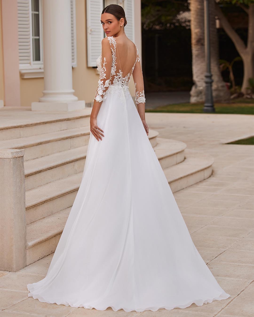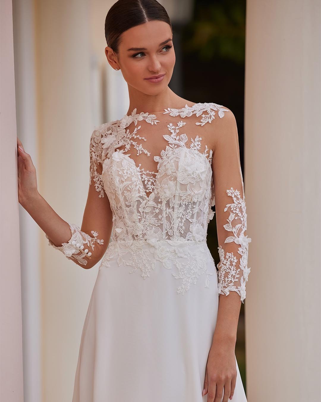 Abito da sposa in georgette, simbolo di eleganza classica e raffinatezza. Il corpetto con scollo a V e le maniche a tre quarti donano equilibrio e sofisticazione, mentre la gonna regala movimento e armonia alla figura.