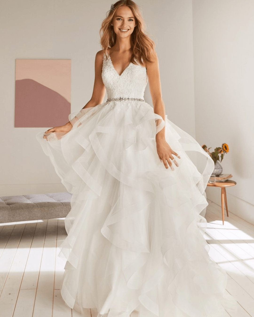 Volant, strass e ricami. Una squisita combinazione di particolari che creano un sensuale abito da sposa a principessa di grande carattere e personalità: