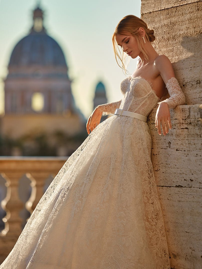 Per ogni principessa moderna: abito da sposa con ampia gonna in pizzo chantilly e bustier smanicato. La cintura sul girovita e i manicotti staccabili completano questo look raffinato e grintoso!
