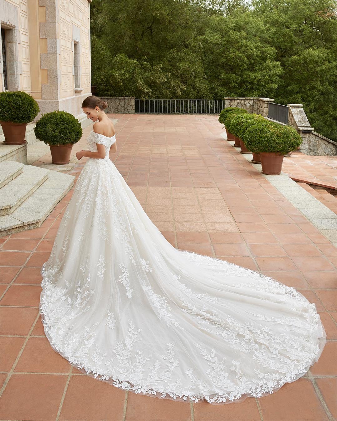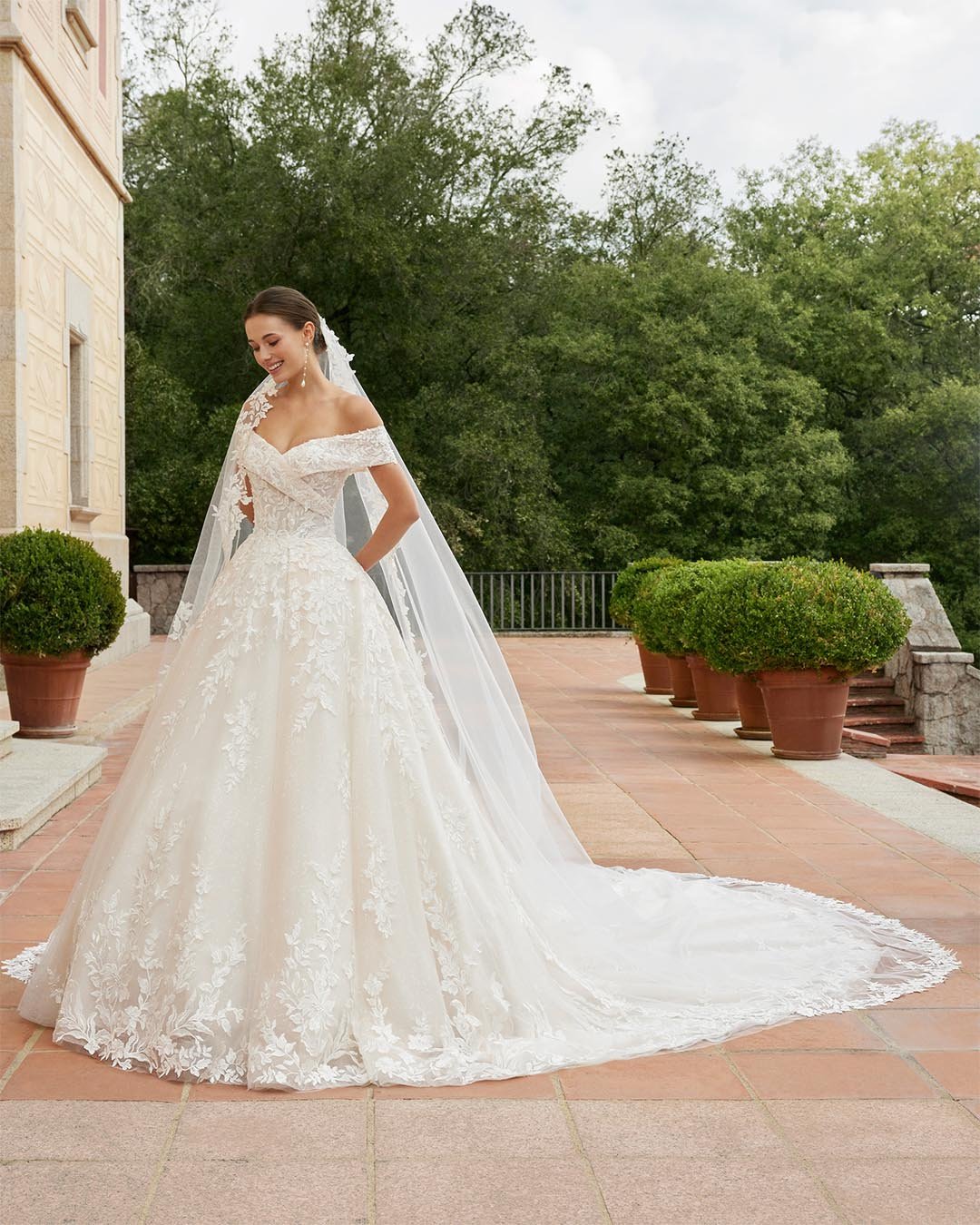Abito da sposa principessa lungo realizzato in tulle e pizzo ricamato. Il corpetto con scollo off-shoulder avvolge delicatamente le spalle e lascia spazio a una romantica schiena scoperta. La gonna ampia e sontuosa si apre in un lungo strascico interamente decorato da motivi floreali in pizzo, per un effetto da vera regina nel giorno delle nozze.