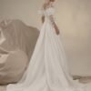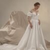 Abito da sposa linea A in raso con scollo off-shoulder. L’eleganza del tessuto lucente si unisce a un delicato bolero in pizzo ricamato che arricchisce il look con raffinatezza. Un modello classico e femminile, ideale per la sposa che desidera un’eleganza senza tempo.