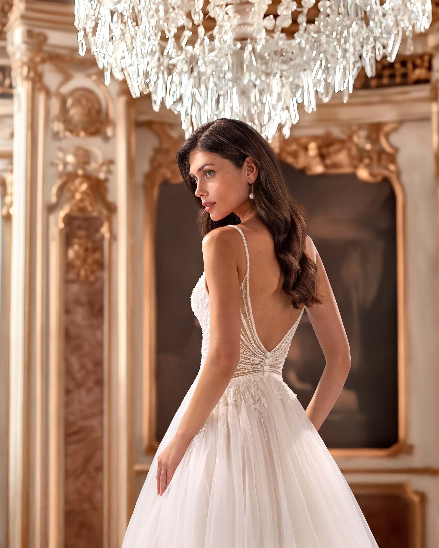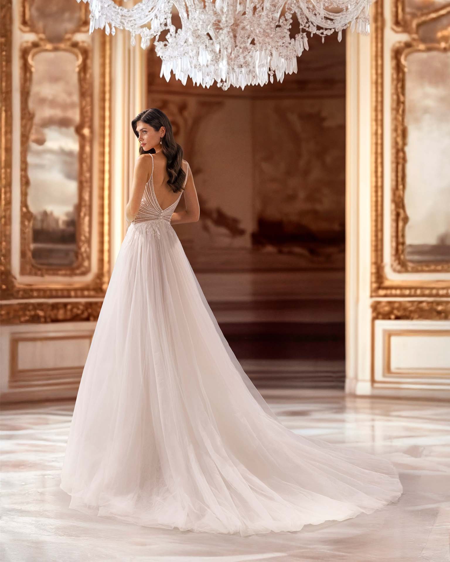 Abito da sposa linea A in tulle, impreziosito da pizzo e perline. Il corpetto con scollo profondo e spalline perlate valorizza la silhouette con delicatezza, mentre la schiena scoperta aggiunge sensualità ed eleganza. La gonna leggera con spacco laterale dona movimento e un tocco contemporaneo, ideale per una sposa che vuole sentirsi romantica e sofisticata.