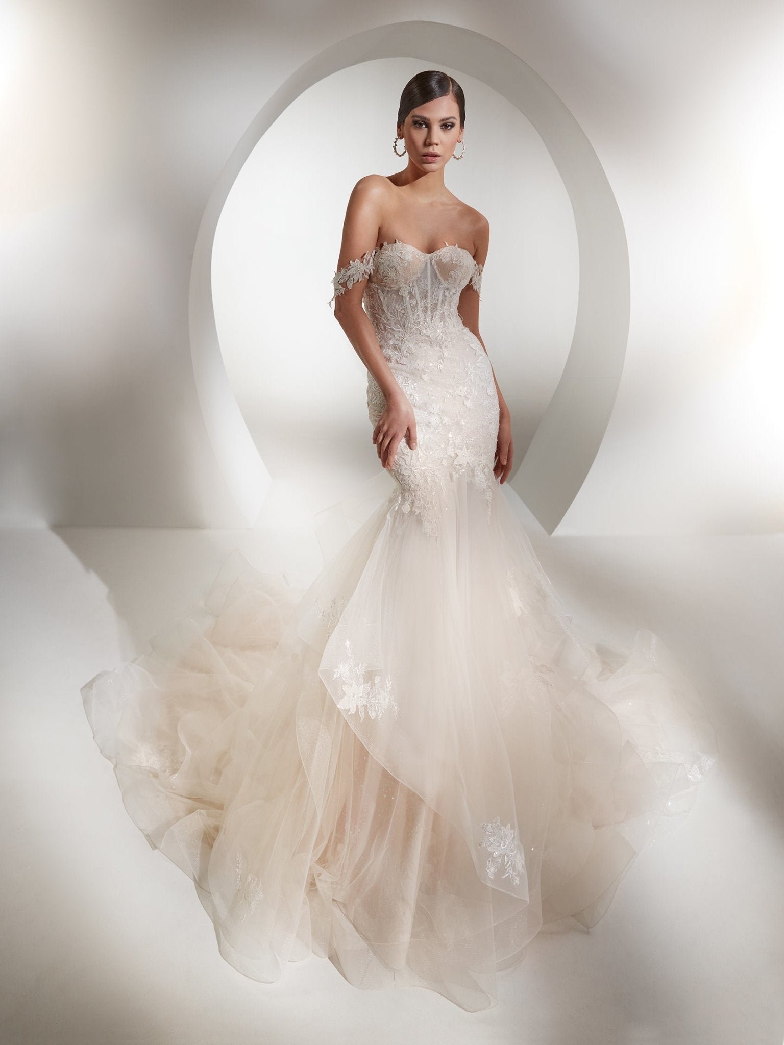 Per la sposa che cerca una sensualità couture: abito da sposa a sirena in tulle cipriato e pizzo ricamato. Il bustino strutturato e le spalline off the shoulder fasciano e valorizzano la tua unicità!
