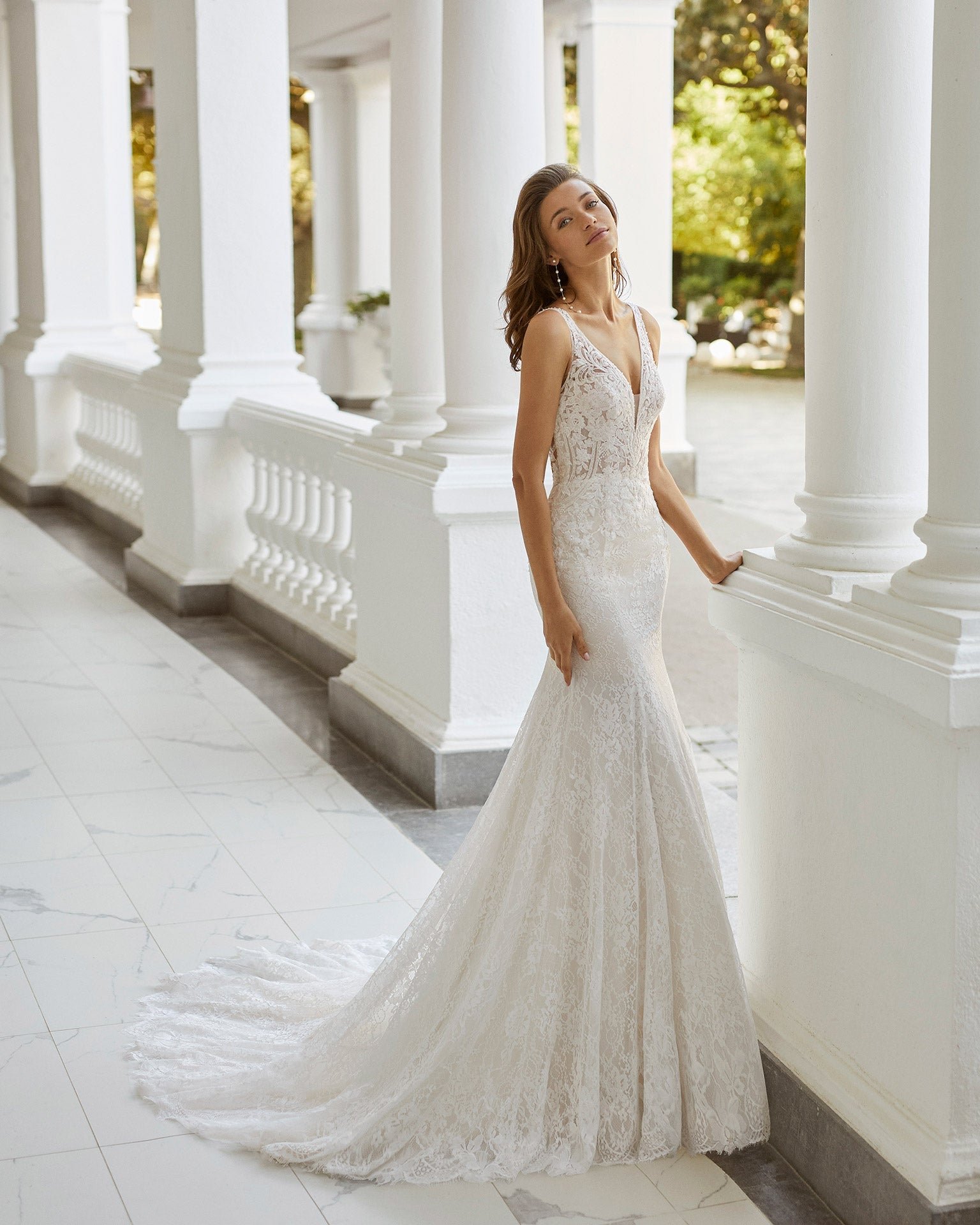 Abito da sposa in pizzo con perline stile sirena. Con scollo a V e schiena illusione abbottonata.