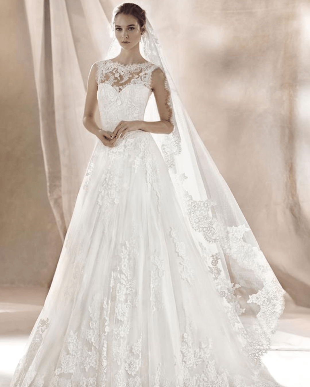 Abito sposa dalla linea svasata in pizzo e morbido tulle, la scollatura sulla schiena è impreziosita da una chiusura a corsetto con lacci.