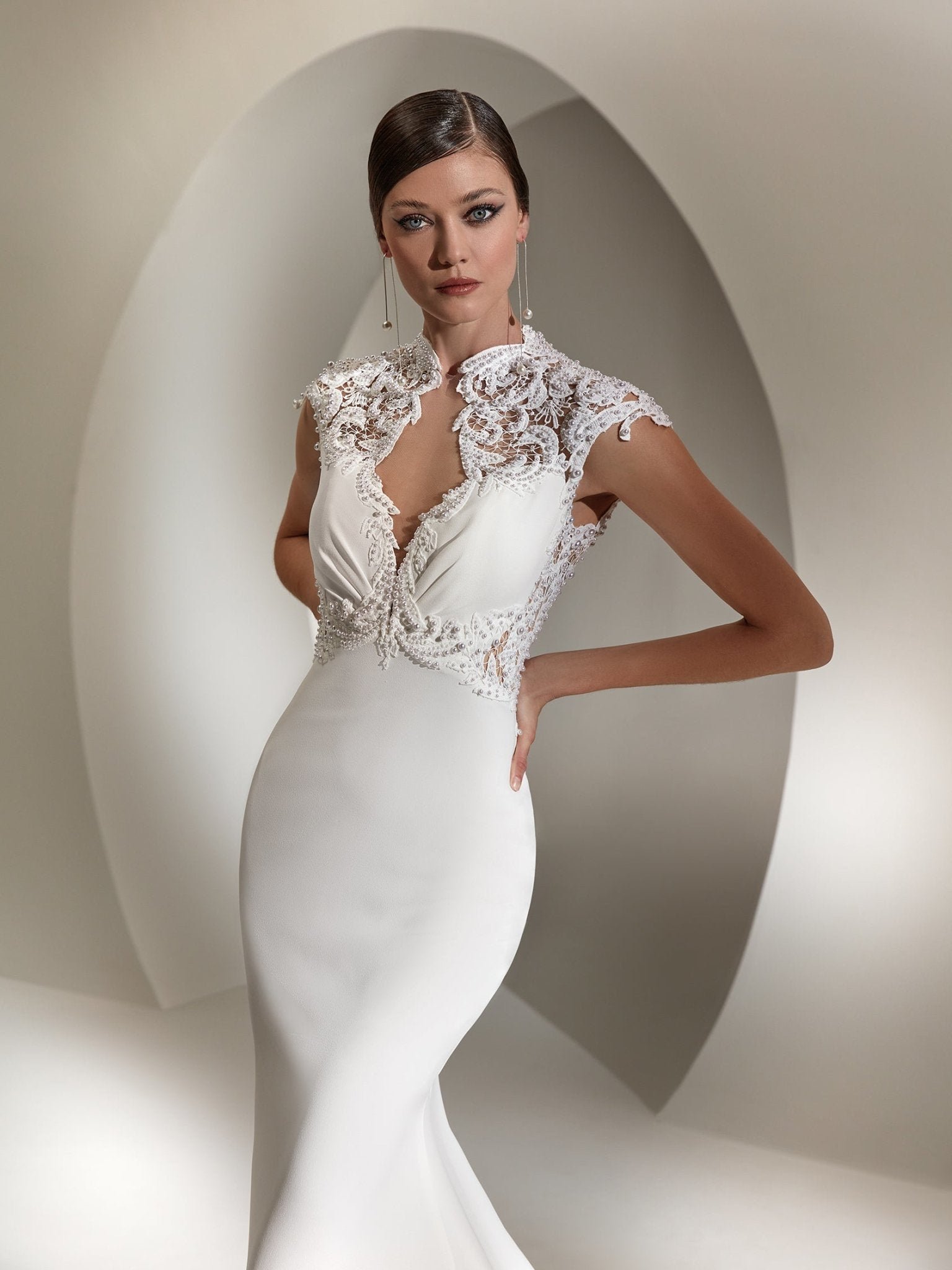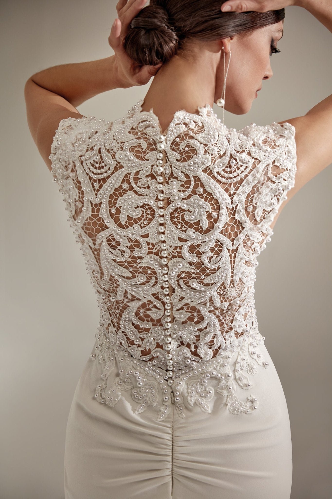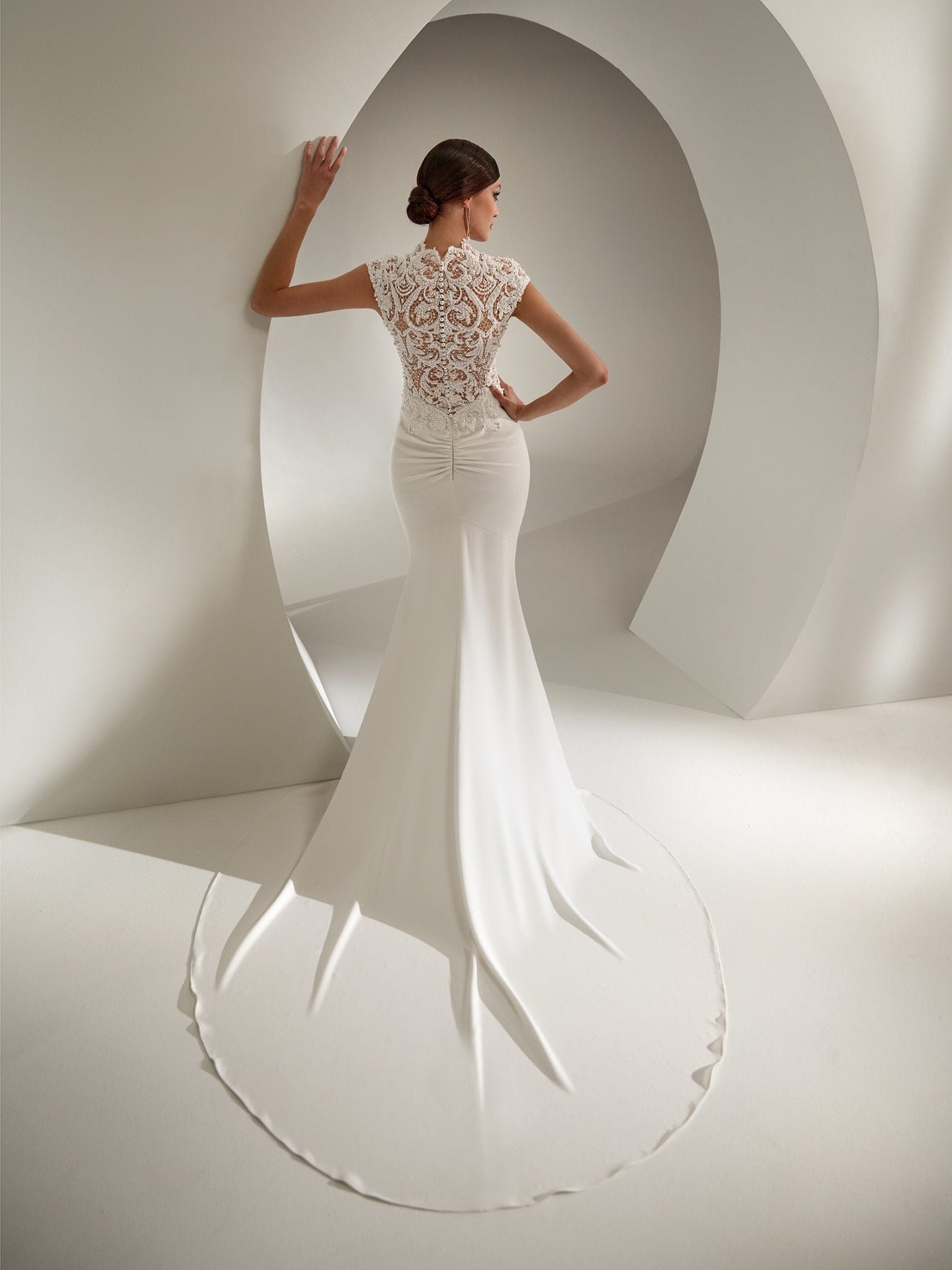 Abito da sposa a sirena in crepe con strascico. Il corpino di pizzo rivela un design mozzafiato sulla schiena.. Semplicemente unico!